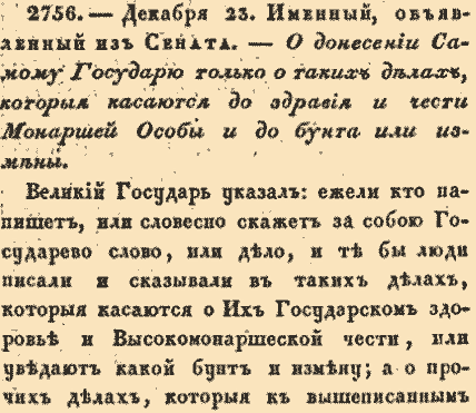 Закон № 2756. 1713 год. 23 декабря (3 января 1714 г.). Указ об ограничении применения формулы «Слово и дело» исключительно государственными преступлениями.