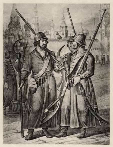 Одежда и вооружение стрельцов XVI—XVII вв. Литография XIX века