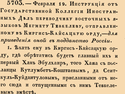 Закон № 5703. 1731 год. 19 февраля (2 марта). Инструкция Государственной Коллегии иностранных дел переводчику А. И. Тевкелеву о порядке приведения хана Абулхаира и казахского народа в российское подданство.