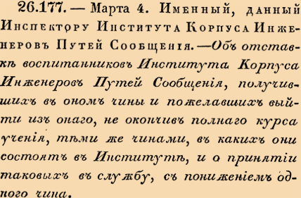 26177. 1816 год. 16 марта (4 марта ст.ст.) Именный, данный Инспектору Института Корпуса Инженеров Путей Сообщения. Об отставке воспитанников Института Корпуса Инженеров Путей Сообщения, получивших в оном чины и пожелавших выйти из онаго, не окончив полнаго курса учения, теми же чинами, в каких они состоят в Институте, и о принятии таковых в службу, с понижением одного чина.