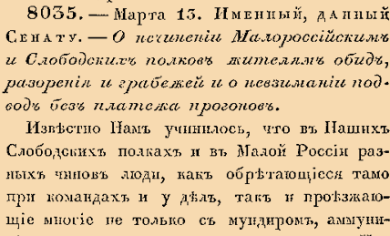8035. 1740 год. 24 марта (13 марта ст.ст.) Именный, данный Сенату. О нечинении Малороссийским и Слободских полков жителям обид, разорения и грабежей и о невзимании подвод без платежа прогонов. Известно нам учинилось, что в Наших Слободских полках и в Малой России разных чинов люди, как обретающиеся тамо при командах и у дел, так и проезжающие многие не только с мундиром, амунициею и с прочими военными и другими Нашими припасами, но и с партикулярными своими обозами ездя, поступают с тамошними жителями безсовестно и не смотря на запретительные толь многие Наши указы, чинят великие обиды и разорения, берут нагло подводы без подорожных и без платежа прогонов <…> что Нам и указам Нашим чинят весьма противно