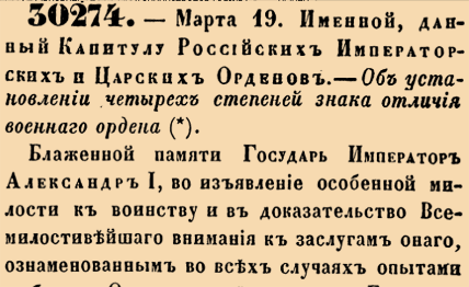 30274. 1856 год. 31 марта (19 марта ст.ст.) Именной, данный Капитулу Российских Императорских и Царских Орденов. Об установлении четырех степеней знака отличия военнаго ордена.Блаженной памяти Государь Император Александр I, во изъявление особенной милости к воинству и в доказательство Всемилостивейшаго внимания к заслугам онаго, ознаменованным во всех случаях опытами любви к Отечеству, верности к Государю, ревности к службе и неустрашимой храбрости <…>