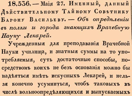 18536. 1798 год. 7 июня (27 мая ст.ст.). Именный, данный Действительному Тайному Советнику Барону Васильеву. Об определении в полки и города знающих Врачебную Науку Лекарей.Учрежденныя для преподавания Врачебной Науки училища, и знатныя суммы на то употребляемыя, суть достаточные способы, посредством коих не без основания можно бы надеяться иметь искусных Лекарей, и нельзя конечно усумниться, чтоб таковых в числе вольноопределящихся и выпускаемых из училищ не было <…>