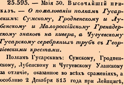 25595. 1814 год. 11 июня (30 мая ст.ст.) Высочайший приказ. О пожаловании полкам Гусарским: Сумскому, Гродненскому и Лубенскому и Малороссийскому Гренадерскому знаков на кивера, а Чугуевскому Гусарскому серебряных труб с Георгиевскими крестами.Полкам Гусарским: Сумскому, Гродненскому, Лубенскому и Чугуевскому Уланскому за отличие, оказанное во всех сражениях, а особливо 2 декабря 813 года при Лейпциге, а Малороссийскому Гренадерскому в сражении 18 Марта при Париже, жалуются, первым трем и Малороссийскому Гренадерскому установленные на кивера знаки с надписью: за отличие <…>