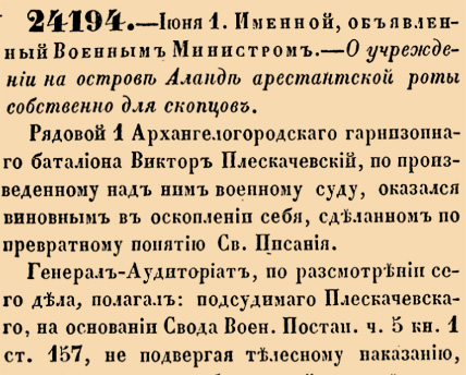 24194. 1850 год. 13 июня (1 Июня ст.ст.) Именной, объявленный Военным Министром. О учреждении на острове Аланд арестантской роты собственно для скопцов.Рядовой 1 Архангелогродскаго гарнизоннаго баталиона Виктор Плескачевский, по произведенному над ним военному суду, оказался виновным в оскоплении себя, сделанном по превратному понятию Св. Писания <…>