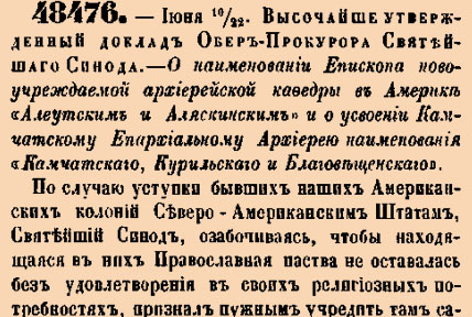 48476. 1870 год. 22 июня (10 июня ст.ст.) Высочайше утвержденный доклад Обер-Прокурора Святейшаго Синода. О наименовании Епископа новоучреждаемой архиерейской кафедры в Америке «Алеутским и Аляскинским» и о усвоении Каматскому Епархиальному Архиерею наименования «Камчатскаго, Курильскаго и Благовещенскаго».По случаю уступки бывших наших Амеркианских колоний Северо-Американским Штатам, Святейший Синод, озабочиваясь, чтобы находящаяся в них Православная паства не оставалась без удовлетворения в своих религиозных потребностях, признал нужным учредить там самостоятельную архиерейскую кафедру, с наименованием Архиерея Новоархангельским и Алеутским, на что и последовало в Мае минувшаго года Высочайшее соизволение <…>