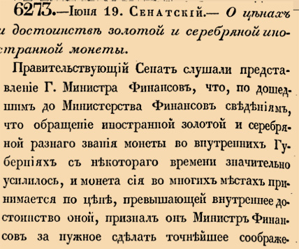 6273. 1833 год. 1 июля (19 июня ст.ст.) Сенатский. О ценах и достоинстве золотой и серебряной иностранной монеты.Правительствующий Сенат слушали представление г. Министра Финансов, что, по дошедшим до Министерства Финансов сведениям, что обращение иностранной золотой и серебряной разнаго звания монеты во внутренних Губерниях с некотораго времени значительно усилилось, и монета сия во многих местах принимается по цене, превышающей внутреннее достоинство оной <…>