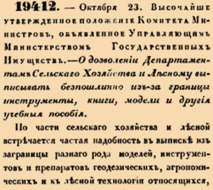 Закон № 19412 — 1845 год 4 ноября (23 октября). О разрешении Департаментам Сельского Хозяйства и Лесному ввозить из-за границы учебные пособия и инструменты без уплаты пошлин.