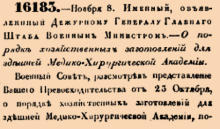 16183. 1842 год. 8 ноября (20 ноября). Именный, объявленный Дежурному Генералу Главнаго Штаба Военным Министром. О порядке хозяйственных заготовлений для здешней Медико-Хирургической Академии.