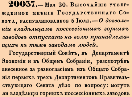 20037. 1846. 1 июня (20 мая ст.ст.) Высочайше утвержденное мнение Государственнаго Совета, распубликованное 5 Июля. О дозволении владельцам поссесионных горных заводов отпускать на волю принадлежащих к тем заводам людей.<…> Государственный Совет мнением положил: в дополнение подлежащих статей Горанго Устава дозволить владельцам поссесионных горных заводов отпускать на волю, для поступления в свободные состояния, сверхштатных заводских мастеровых и рабочих без всякаго замена их другими; об увольнении же таковых людей из числа, определеннаго штатным положением, предоставить означенным владельцам входить с прошениями к местному горному начальству, которое о подобных случаях входит каждый раз с особыми представлениями к Министру Финансов.