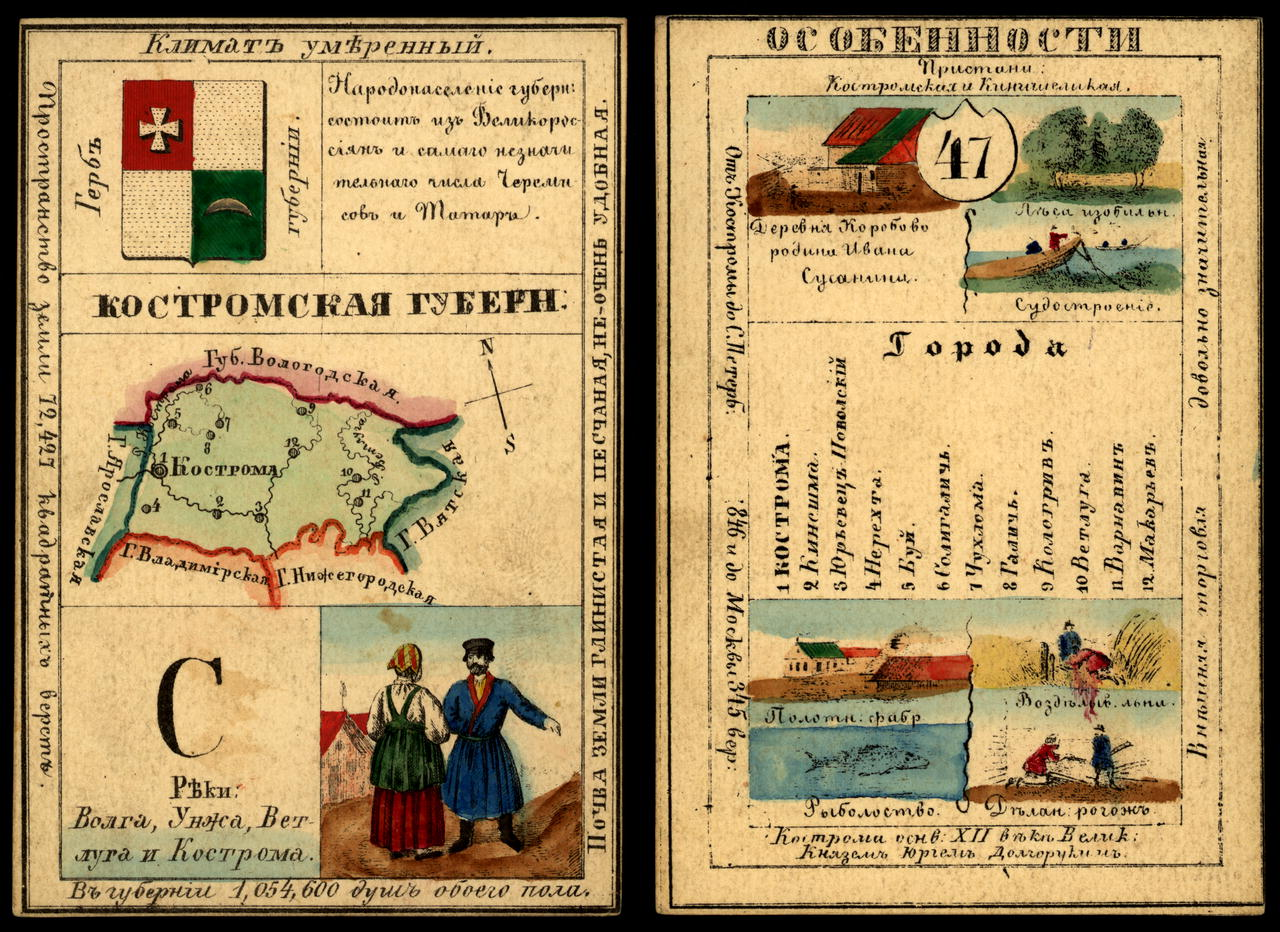 Костромская губерния была расположена в центре Европейской части Российской империи. Граничила на западе с Ярославской, на юге с Владимирский и Нижегородской, на востоке с Вятской, на севере и северо-западе с Вологодской губерниями.