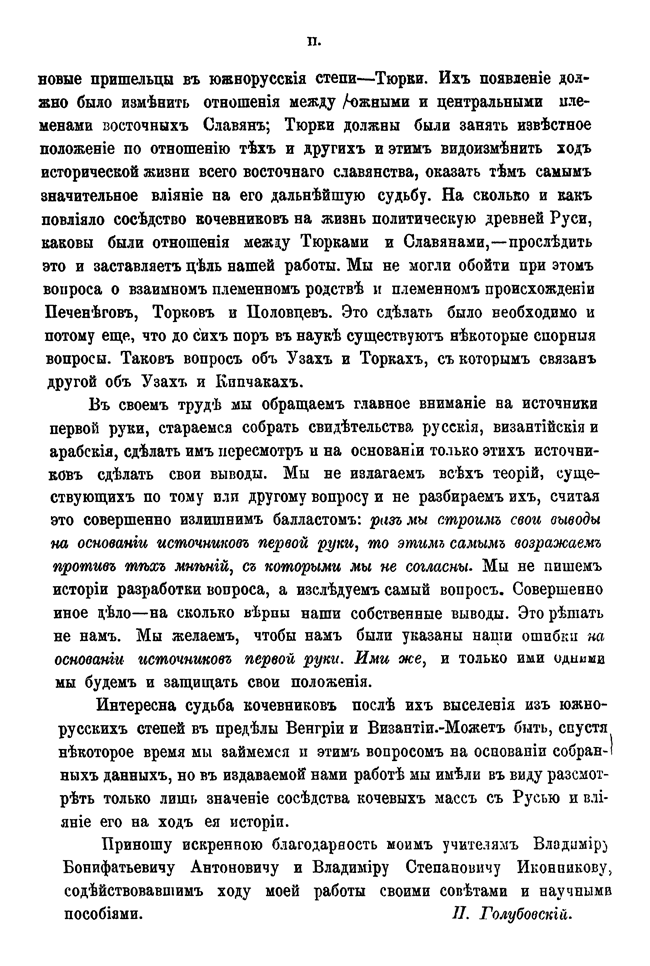 Древние кочевники южно-русских степей — неотъемлемая часть отечественной истории. В своей монографии Голубовский пытается собрать воедино обрывочные сведения о печенегах, торках и половцах, веками беспокоившими границы славянских княжеств. Голубовский не только структурирует исторические данные, но делает заметки по быту и организации жизни степняков.