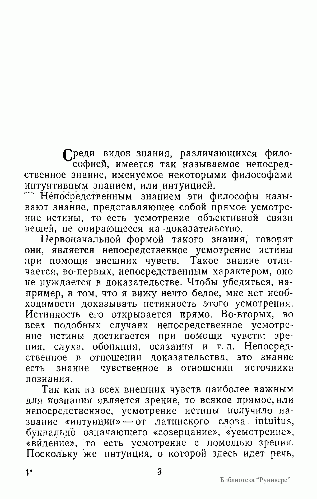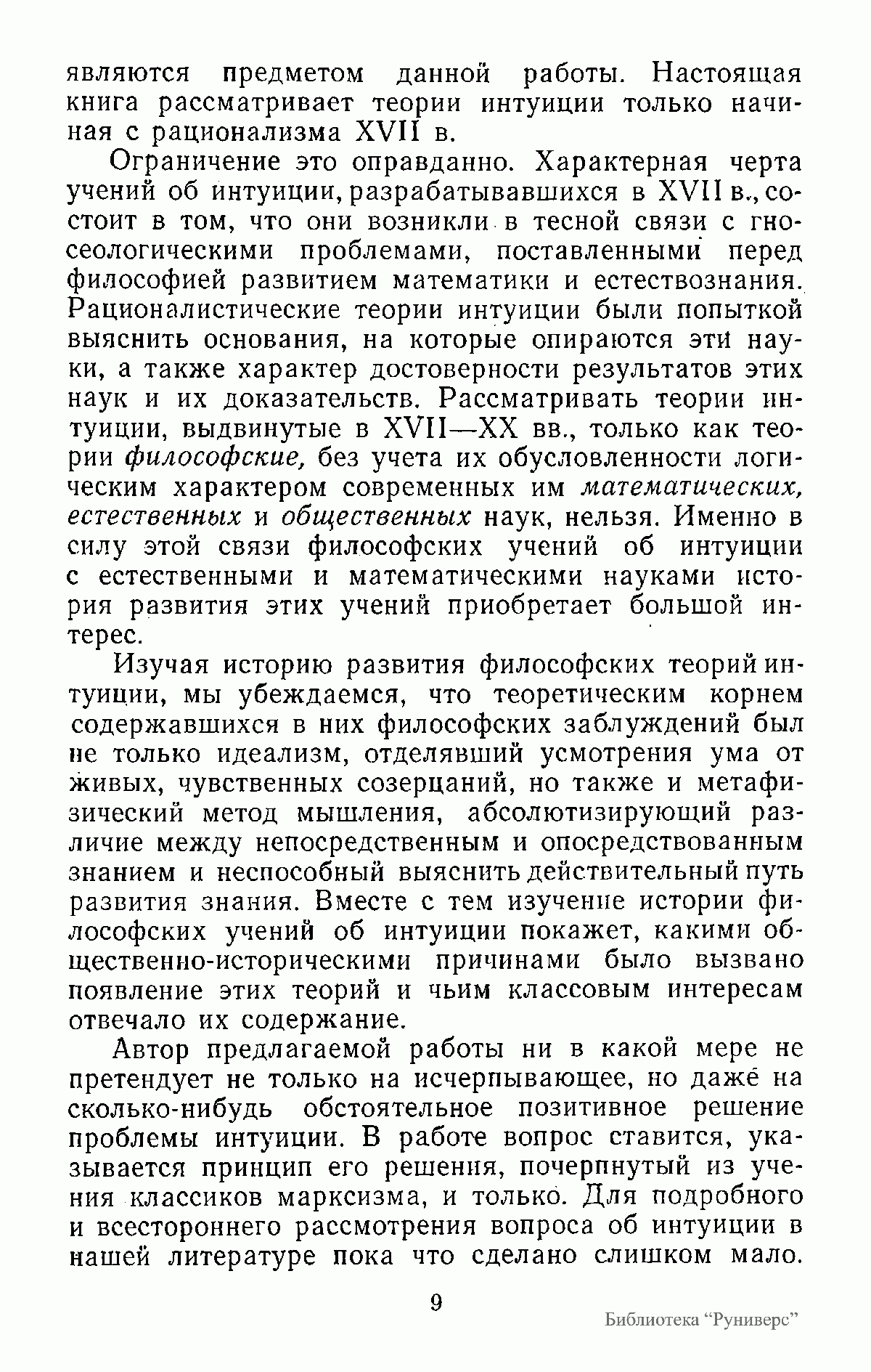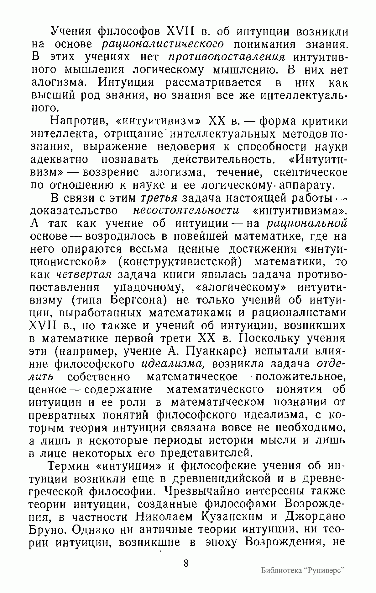 Данная публикация посвящена анализу философских теорий интуиции, сменявших друг друга в истории философии нового времени. Особое внимание уделяется интуитивизму, одному из направлений философии XX века, и его критике. А так как учение об интуиции - на рациональной основе - возродилось в новейшей математике, где на него опираются весьма ценные достижения «интуиционистской» (конструктивистской) математики, то как одной из задач книги явилась задача противопоставления интуитивизму (типа Бергсона) не только учений об интуиции, выработанных математиками и рационалистами XVII в., но также и учений об интуиции, возникших в математике первой трети XX в.