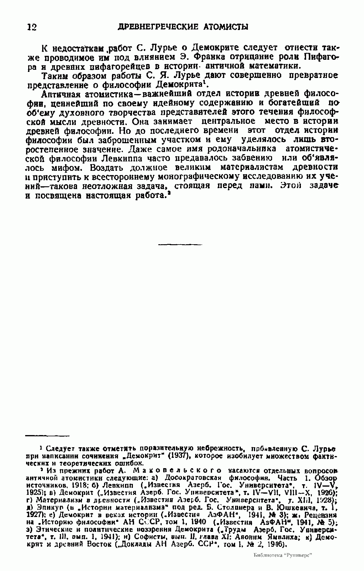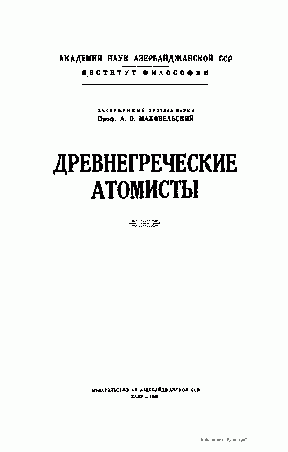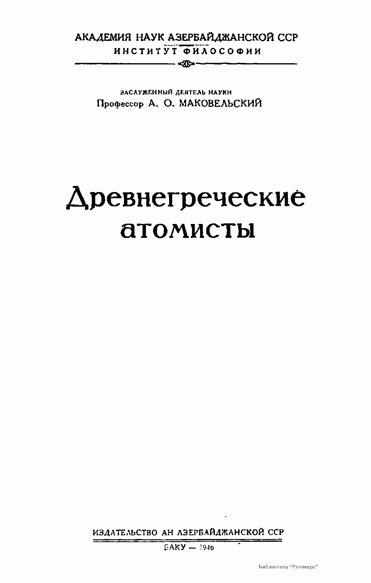 Предлагаемая книга авторитетнейшего специалиста по античности А.О.Маковельского "Древнегреческие атомисты" вышла в 1946 году в Баку и принесла ее автору мировое признание. Вокруг исторического существования философа Левкиппа (ок. 500-440 гг. до нашей эры) велись споры, и высказывалась догадка, что это имя было псевдонимом молодого Демокрита. Однако исследования Дильса и Зеллера, а также Маковельского подтвердили его историческое существование.