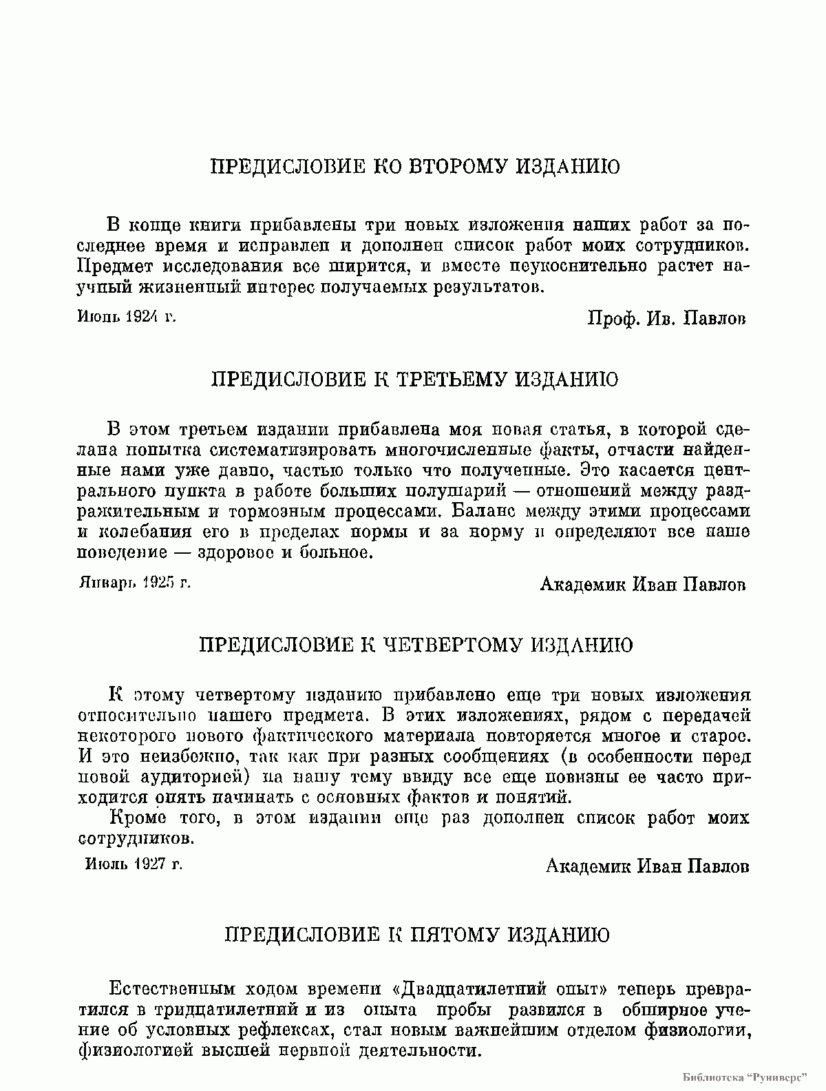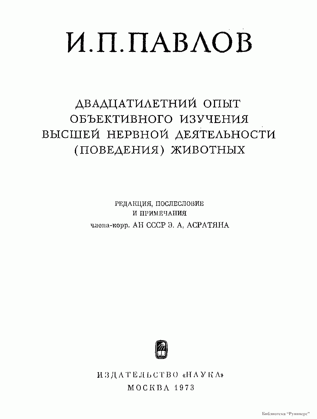 Книга Ивана Петровича Павлова с символическим названием «Двадцатилетний опыт объективного изучения высшей нервной деятельности (поведения) животных» в настоящем наиболее полном ее издании является своеобразной летописью всей, полной драматическими событиями истории зарождения и развития эпохального значения его исследований по физиологии большого мозга, всех этапов формирования, развития и совершенствования его великого материалистического учения о высшей нервной деятельности, отображает всю панораму его подвижнического труда и страстной борьбы за любимое научное детище. Вот почему нам представляется, что в известном отношении главным трудом Павлова, дающим более полное представление об его учении о высшей нервной деятельности, следует считать именно эту книгу.Первое издание этого капитального труда академика И. П. Павлова было осуществлено пятьдесят лет тому назад. Настоящее 10-е издание этой книги на русском языке, в основу которого положено шестое издание, подготовленное к печати самим автором, является по существу юбилейным, к тому же вдвойне юбилейным. В 1973 г. исполнилось не только пятьдесят лет со времени первого издания «Двадцатилетнего опыта» Павлова, но и семьдесят лет со времени его исторической речи на Международном медицинском конгрессе в Мадриде под названием «Экспериментальная психология и психопатология па животных», речи яркой, смелой, программной, возвещающей научный мир об официальном рождении великого учения о высшей нервной деятельности — одного из величайших достижений естествознания столетия.Книга рассчитана на физиологов, психологов, медиков, философов и широкий круг биологов.
