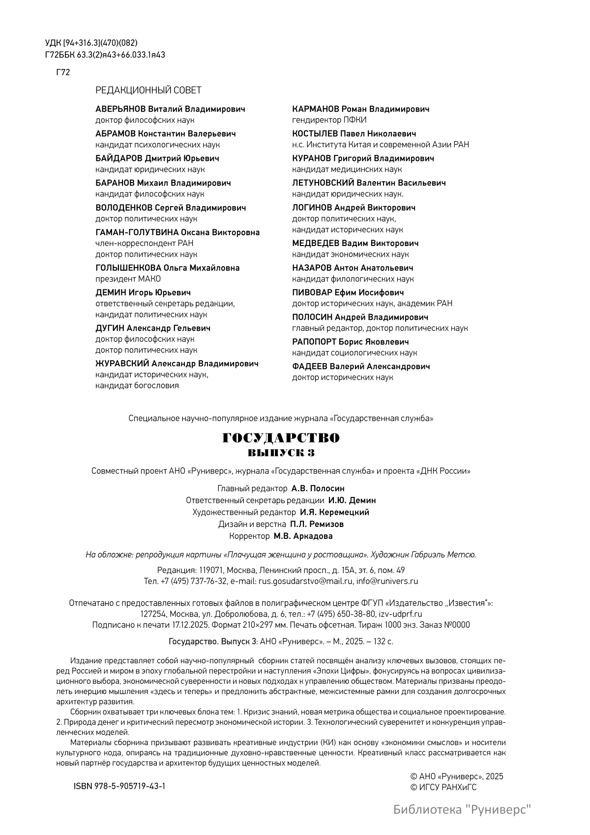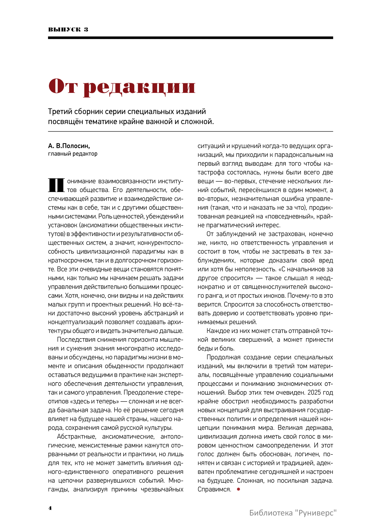 Издание представляет собой научно-популярный сборник с татей посвящён анализу ключевых вызовов, стоящих перед Россией и миром в эпоху глобальной перестройки и наступления «Эпохи Цифры», фокусируясь на вопросах цивилизационного выбора, экономической суверенности и новых подходах к управлению обществом. Материалы призваны преодолеть инерцию мышления «здесь и теперь» и предложить абстрактные, межсистемные рамки для создания долгосрочных архитектур развития.