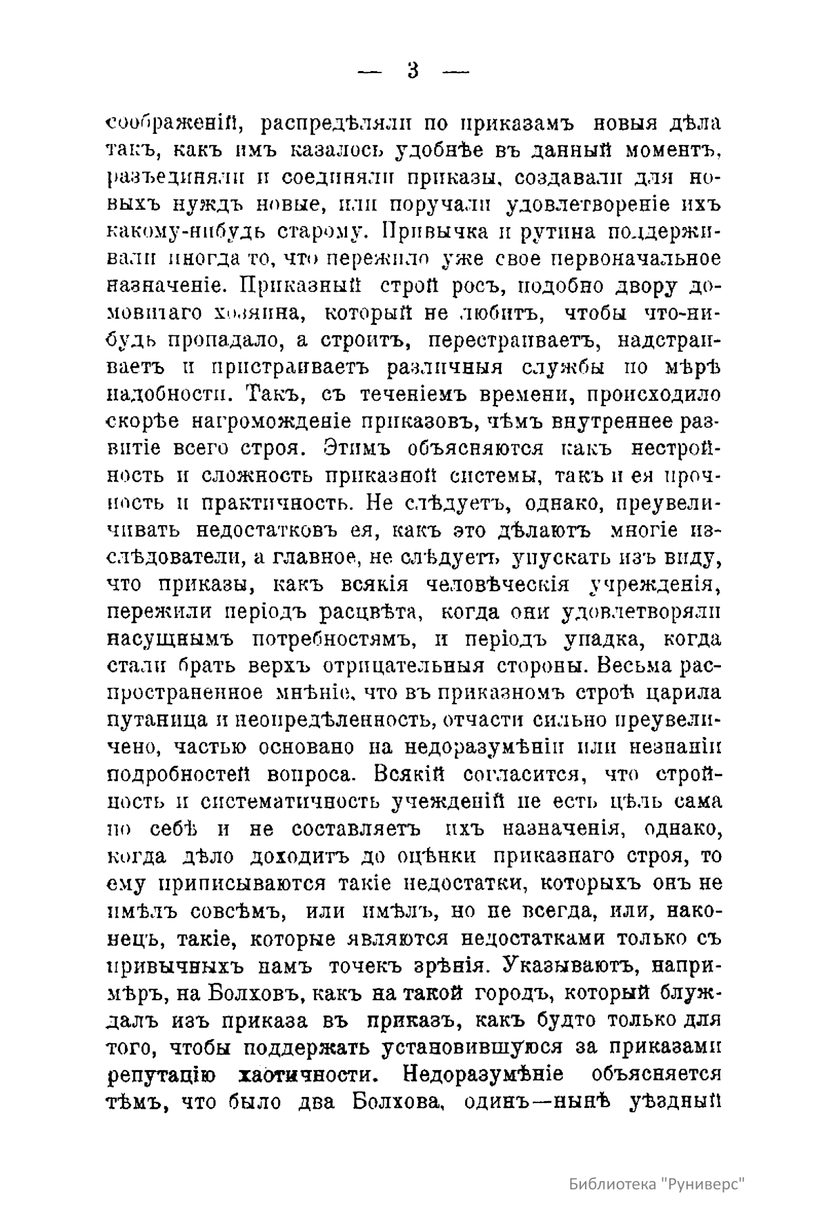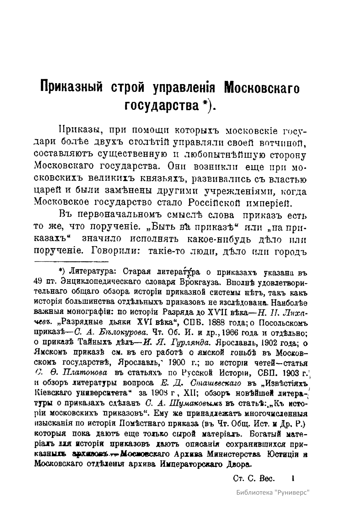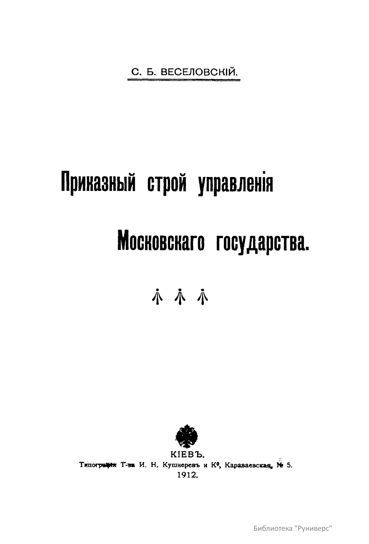 В издании анализируется система приказов, центральных исполнительных органов Московского государства, существовавших более двух столетий, прослеживается эволюция приказов от временных поручений до постоянных учреждений, подчеркивая их органический и несистематизированный рост, который, тем не менее, обеспечил системе практичность и устойчивость. Особое внимание уделяется роли царя как «души» системы, а также проблемам контроля, волокиты и коррупции, которые усилились при царях Михаиле Федоровиче и Алексее Михайловиче, что привело к возникновению Тайного приказа как симптома упадка старой системы. Подробно описывается структура и личный состав приказов (судей, дьяков и подьячих) и дается обзор важнейших приказов по их функциям и территориальной юрисдикции.