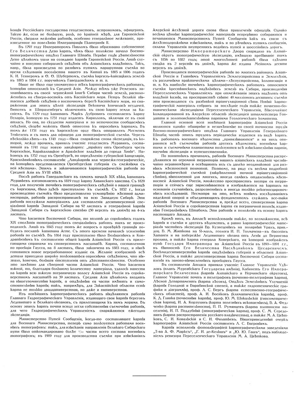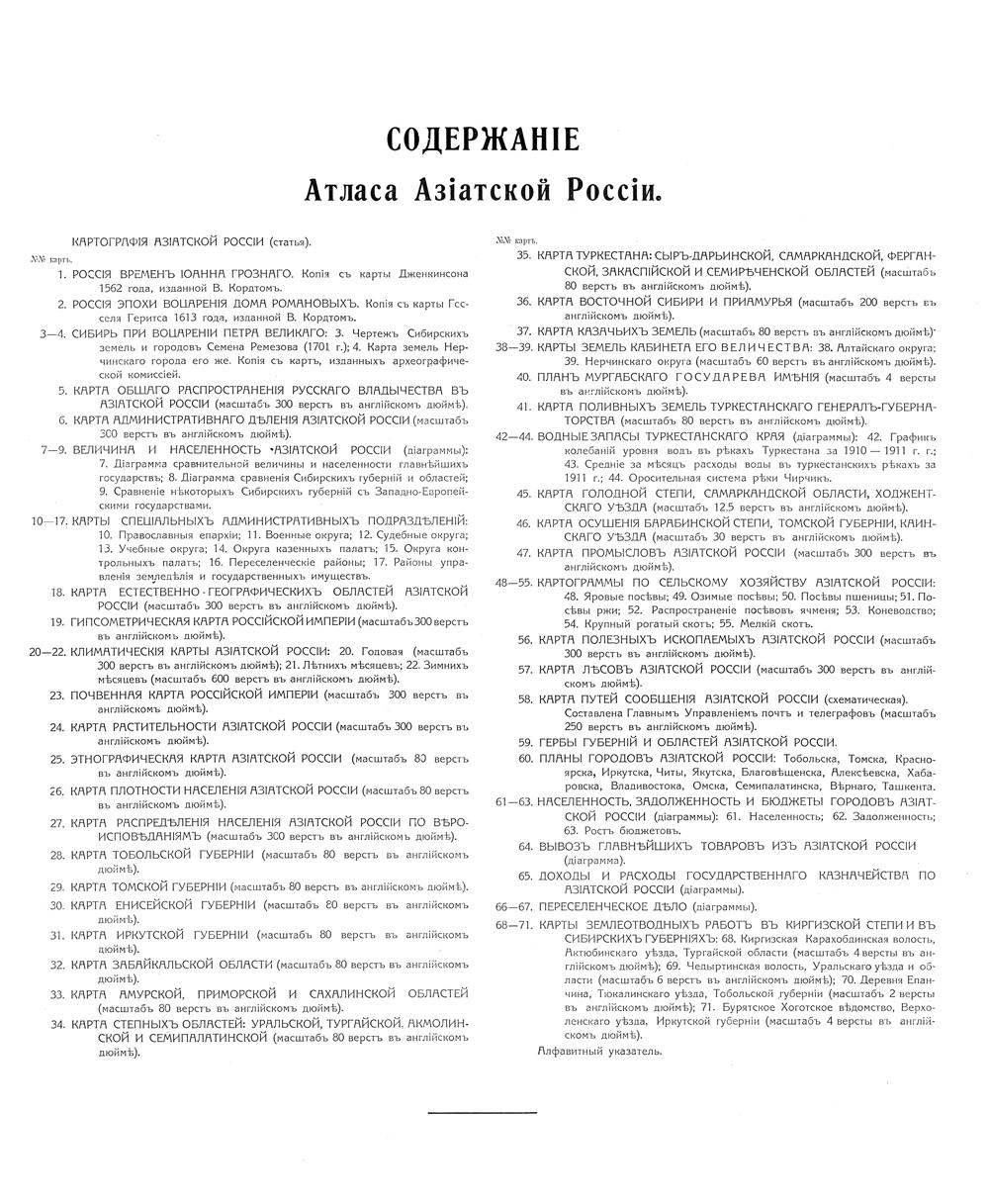 Настоящий атлас как бы повторяет в основных своих чертах наши старинные, времен царя Алексея Михайловича, географические издания. И тогда составленные с возможной для того времени полнотой и тщательностью карты («Большой Чертеж», «Чертеж Сибирской Земли») сопровождались подробным объяснительным текстом («Книга к Большому Чертежу»). Таким образом, настоящий атлас – это современный «чертеж» наших азиатских владений, к которому приложена «книга».