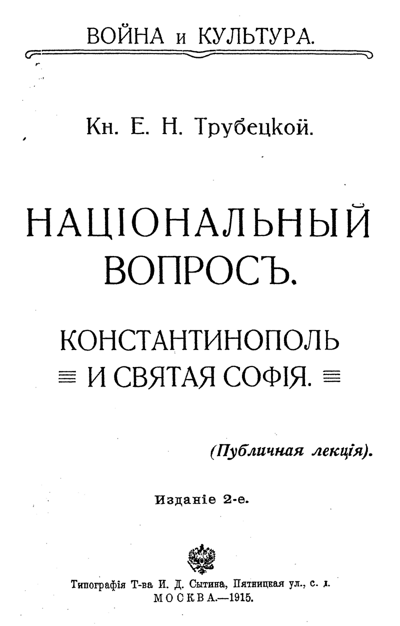В работе «Национальный вопрос, Константинополь и Святая София» кн. Е. Н. Трубецкой стремится осмыслить события Первой мировой войны в свете софийной метафизики