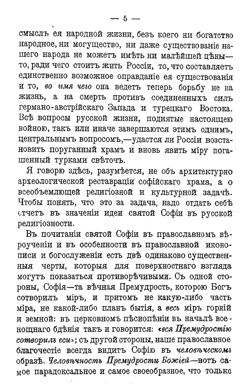 . Размышляя о войне и о месте Константинополя в русской истории, философ приходит к выводу о том, что осуществление Божьего замысла о софийном преображении твари предполагает возвращение Царьграда и Св. Софии в сферу православного мира. «Не для узко-националистической цели, – полагает автор, – а только во имя сверхнародного общечеловеческого смысла Россия может получить в свое обладание Царьград и проливы». Так историко-философский и богословский материал позволяет понять смысл событий и осветить геополитические проблемы.