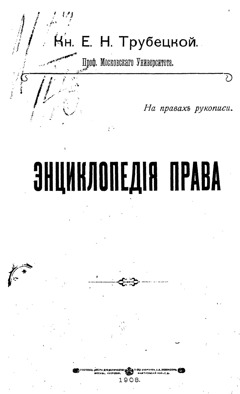 Е. Н. Трубецкой учился на юридическом факультете Московского университета (1881 – 1885) и одновременно изучал историю философии. После окончания университета он становится приват-доцентом Юридического лицея в Ярославле. Здесь и в дальнейшем в Московском университете читает курсы по энциклопедии права и истории философии права. Курс энциклопедии права включает предварительные сведения о праве, его отделах, методах его изучения. Он создает некоторый философский базис для научной работы и синтезирует современные общие учения о праве как основание для изучения самостоятельных правовых дисциплин.
