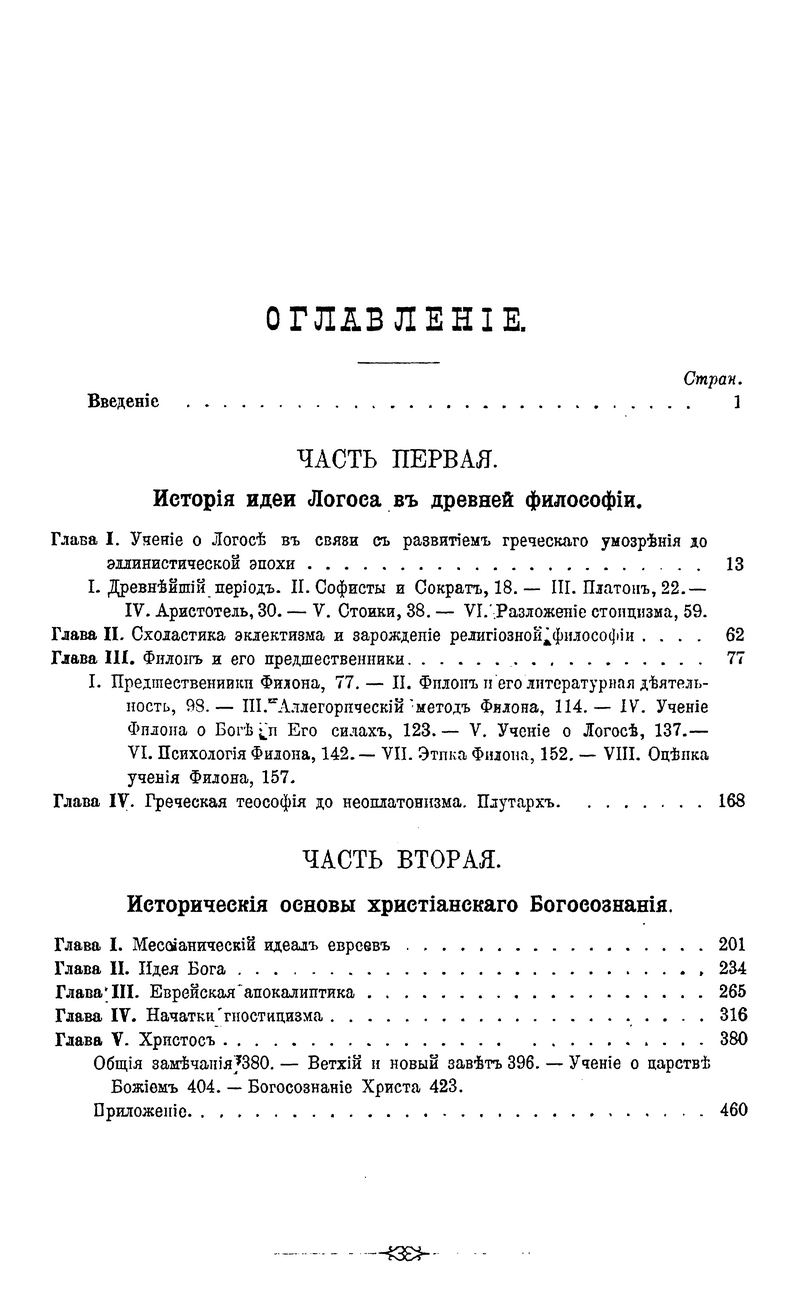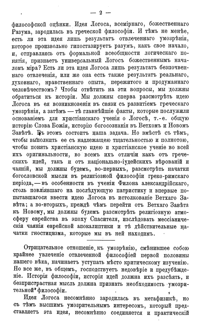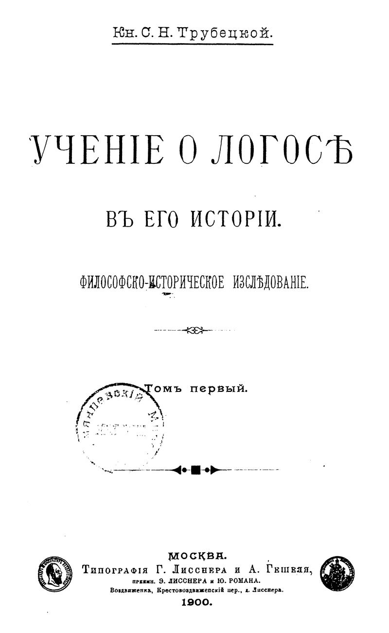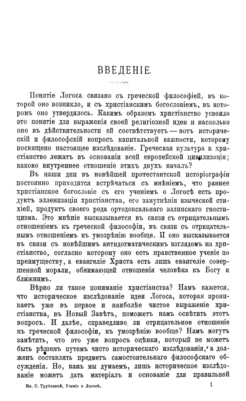 Докторская диссертация С. Н. Трубецкого посвящена понятию «логоса», возникшему в греческой философии и утвердившемуся в христианском богословии. Автор ставит цель выяснить, каким образом христианство, которое признает разум как объективное всемирное и сверхмирное начало, усвоило это понятие для выражения своей религиозной идеи и насколько оно в действительности ей соответствует.
