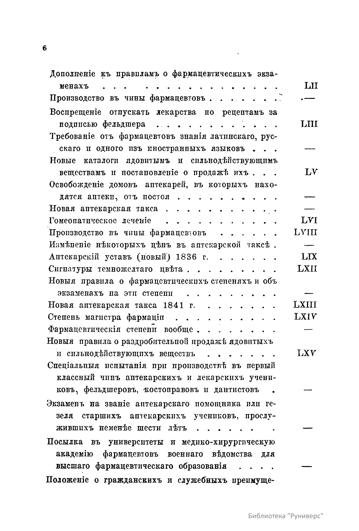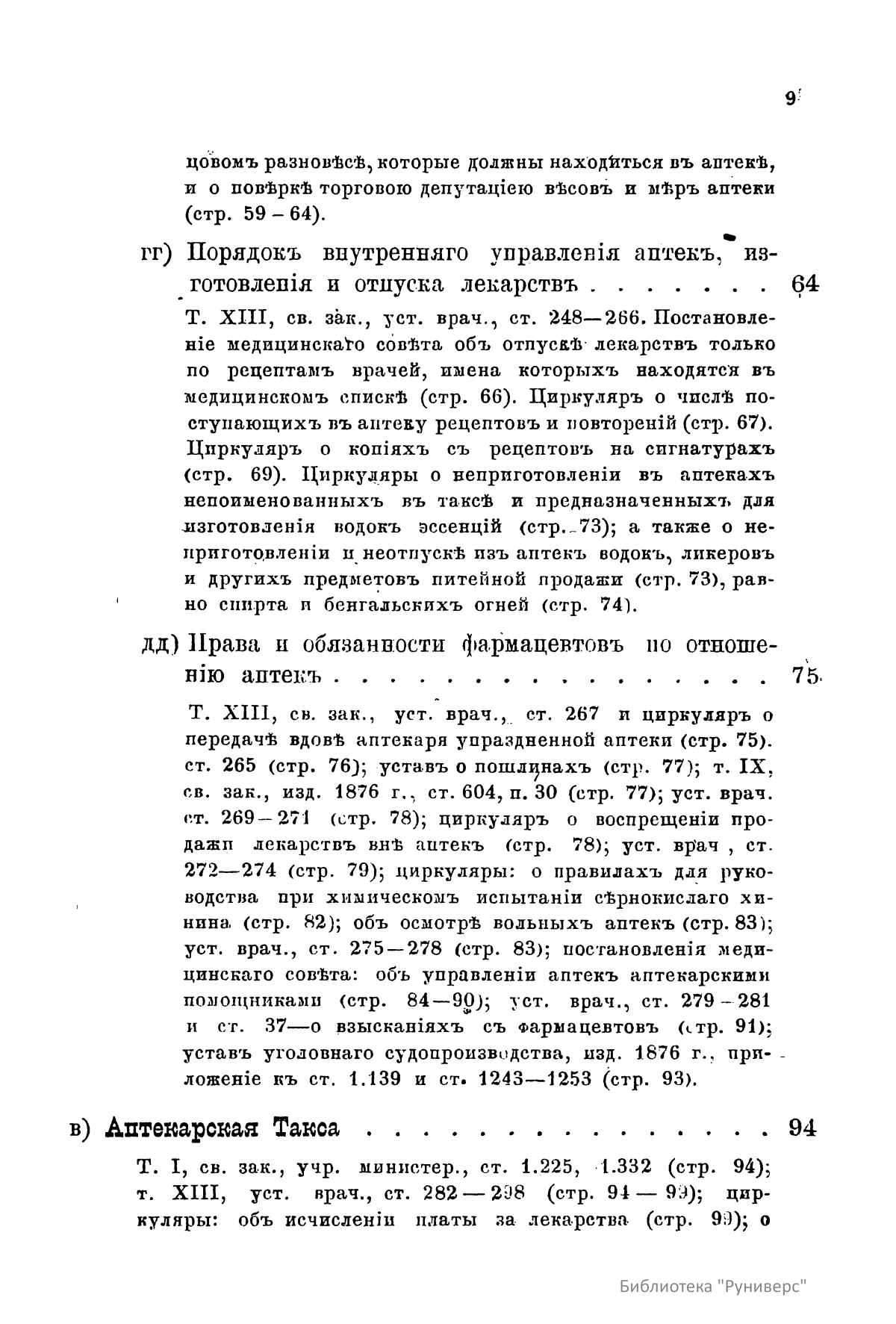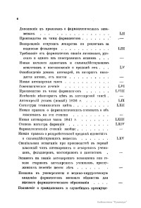 • Учреждение и устройство аптек: Приведены правила открытия новых аптечных заведений, нормы по количеству жителей и рецептов на одну аптеку, а также требования к внутреннему устройству помещений (лабораторий, материальных комнат, ледников),,,.