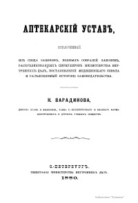 Издание представляет собой фундаментальный труд «Аптекарский устав», составленный доктором прав и философии Н. Варадиновым и изданный в 1880 году в типографии Министерства внутренних дел,.