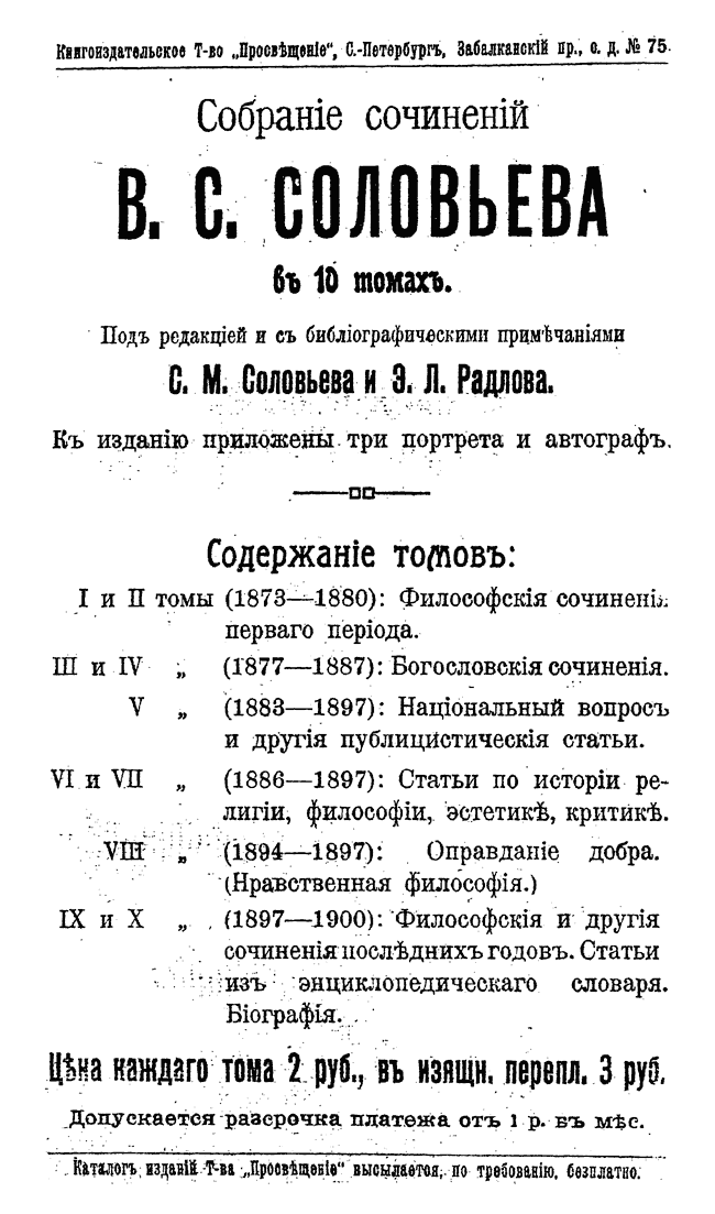 В первые два тома вошли его философские сочинения 1873-1880 гг., в третий – богословские 1877-1884 гг., в четвертом собраны работы, посвященные Церкви 1883-1887 гг., в пятом – публицистические произведения, включая «Национальный вопрос в России», том шестой объединяет критические сочинения, работы по эстетике и труды исторического характера, седьмой том посвящен нравственной философии, а в заключительных томах представлены сочинения последних лет жизни Соловьева.