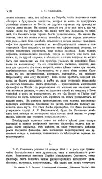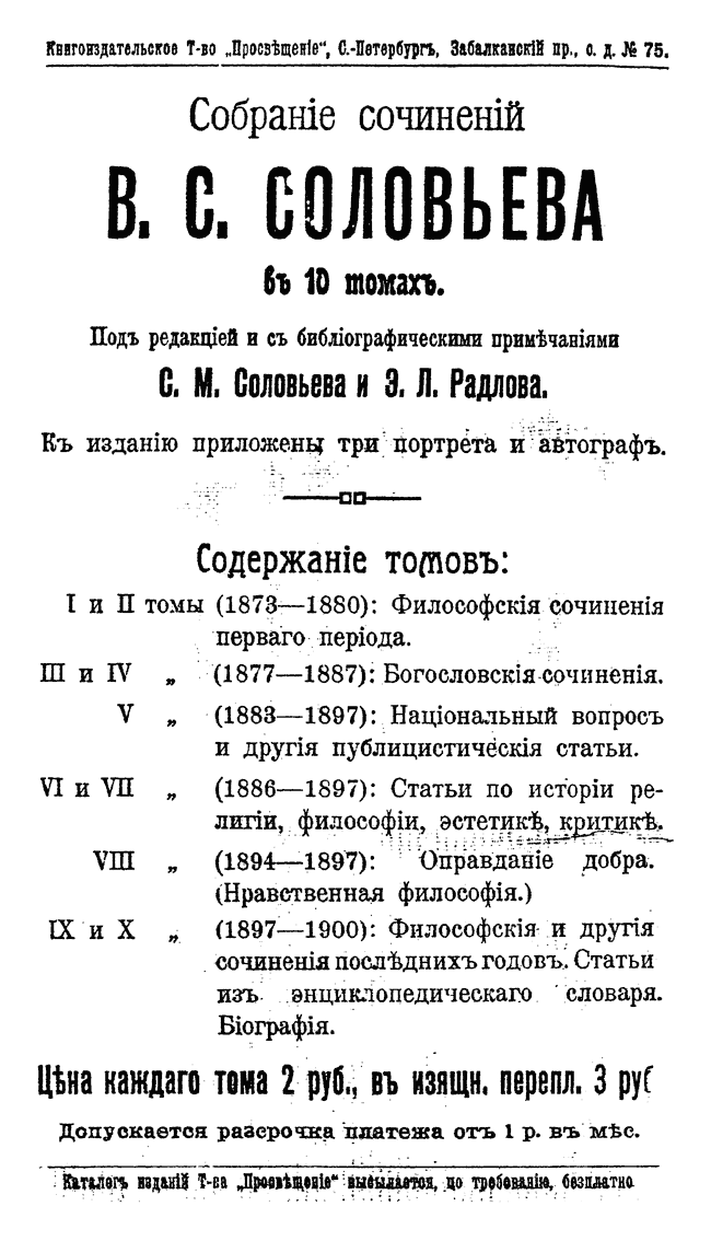 В первые два тома вошли его философские сочинения 1873-1880 гг., в третий – богословские 1877-1884 гг., в четвертом собраны работы, посвященные Церкви 1883-1887 гг., в пятом – публицистические произведения, включая «Национальный вопрос в России», том шестой объединяет критические сочинения, работы по эстетике и труды исторического характера, седьмой том посвящен нравственной философии, а в заключительных томах представлены сочинения последних лет жизни Соловьева.