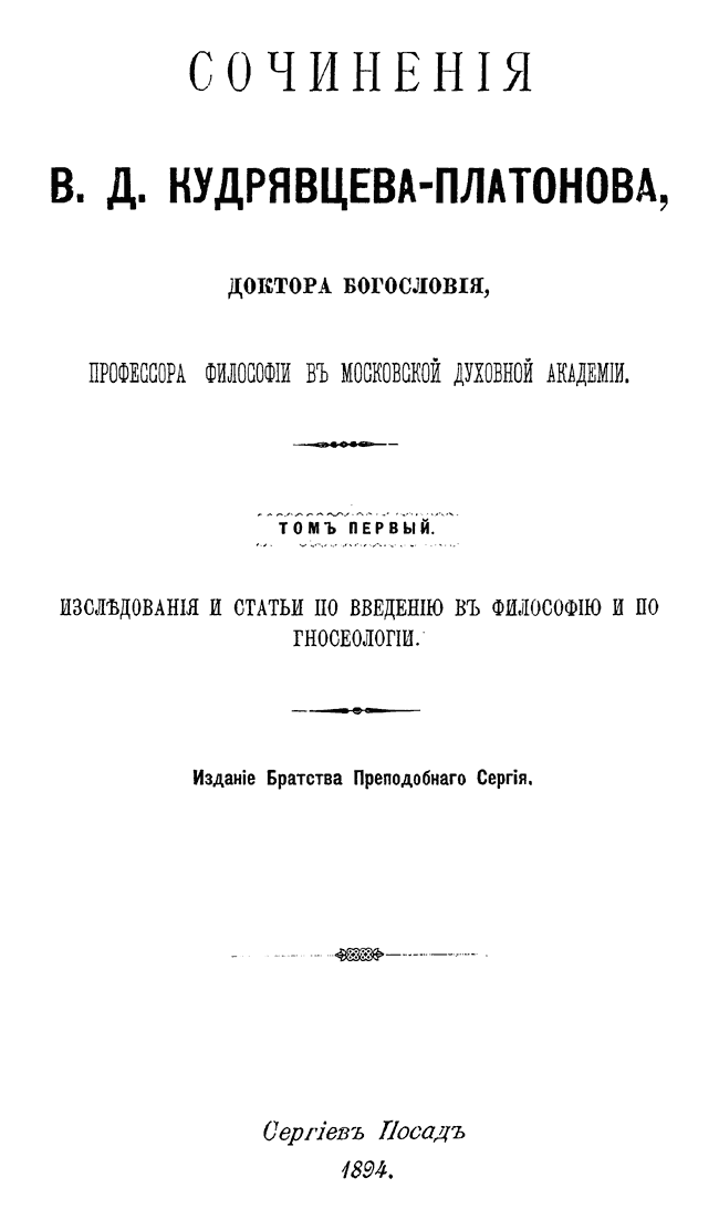 Посмертное издание собрания сочинений видного представителя русского теизма – профессора Московской Духовной академии и Председателя Братства Преподобного Сергия. Несмотря на то, что в истории русской философии Кудрявцев-Платонов не получил известности как основатель оригинальной философской системы, его по праву считают превосходным философским писателем и талантливым выразителем идеи непротиворечивого сочетания философского миросозерцания и христианского учения.