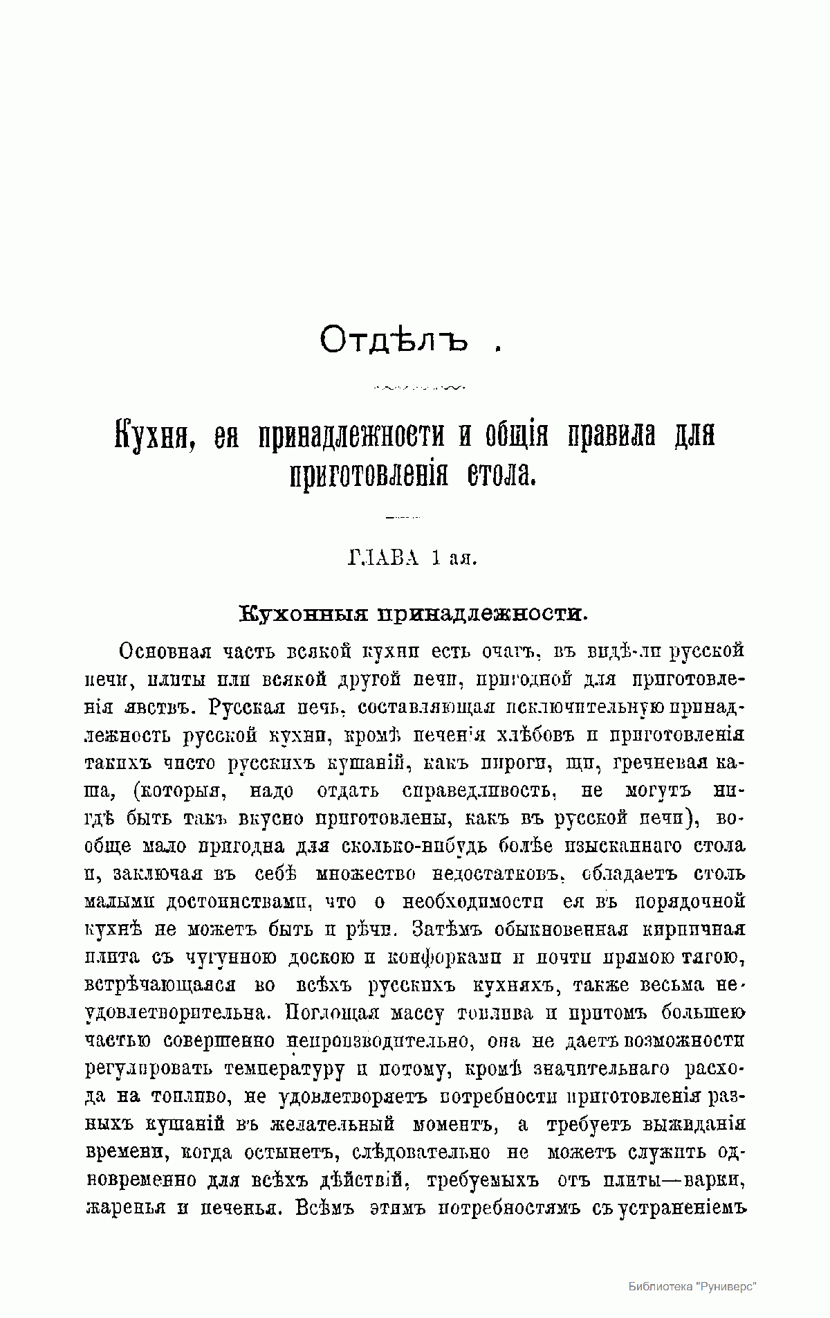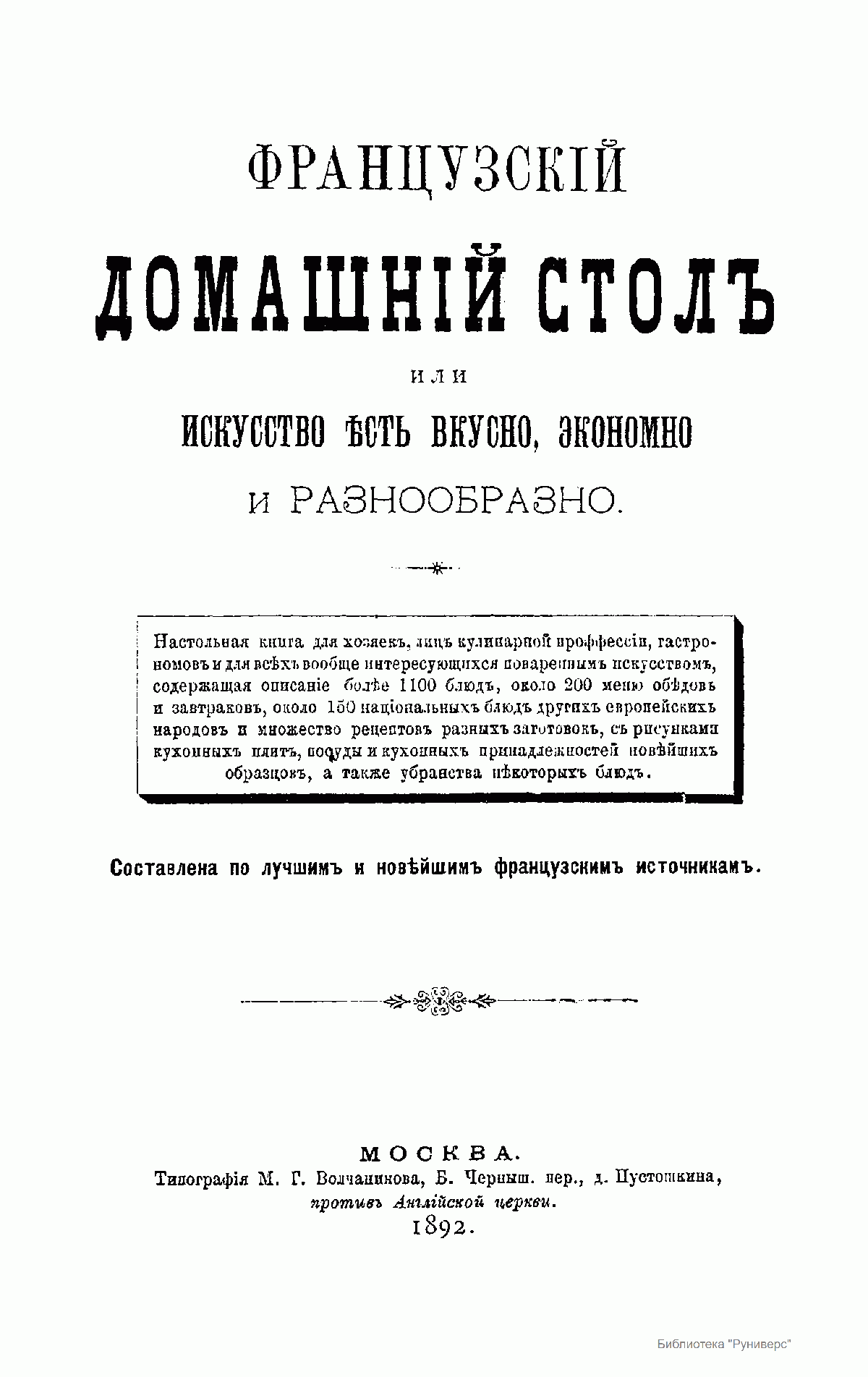 Настольная книга для хозяек, лиц кулинарной профессии, гастрономов и для всех вообще интересующихся поваренным искусством, содержащая описание более 1100 блюд, около 200 меню обедов и завтраков, около 150 национальных блюд других европейских народов и множество рецептов разных заготовок, с рисунками кухонных плит, посуды и кухонных принадлежностей новейших образцов, а также убранства некоторых блюд.