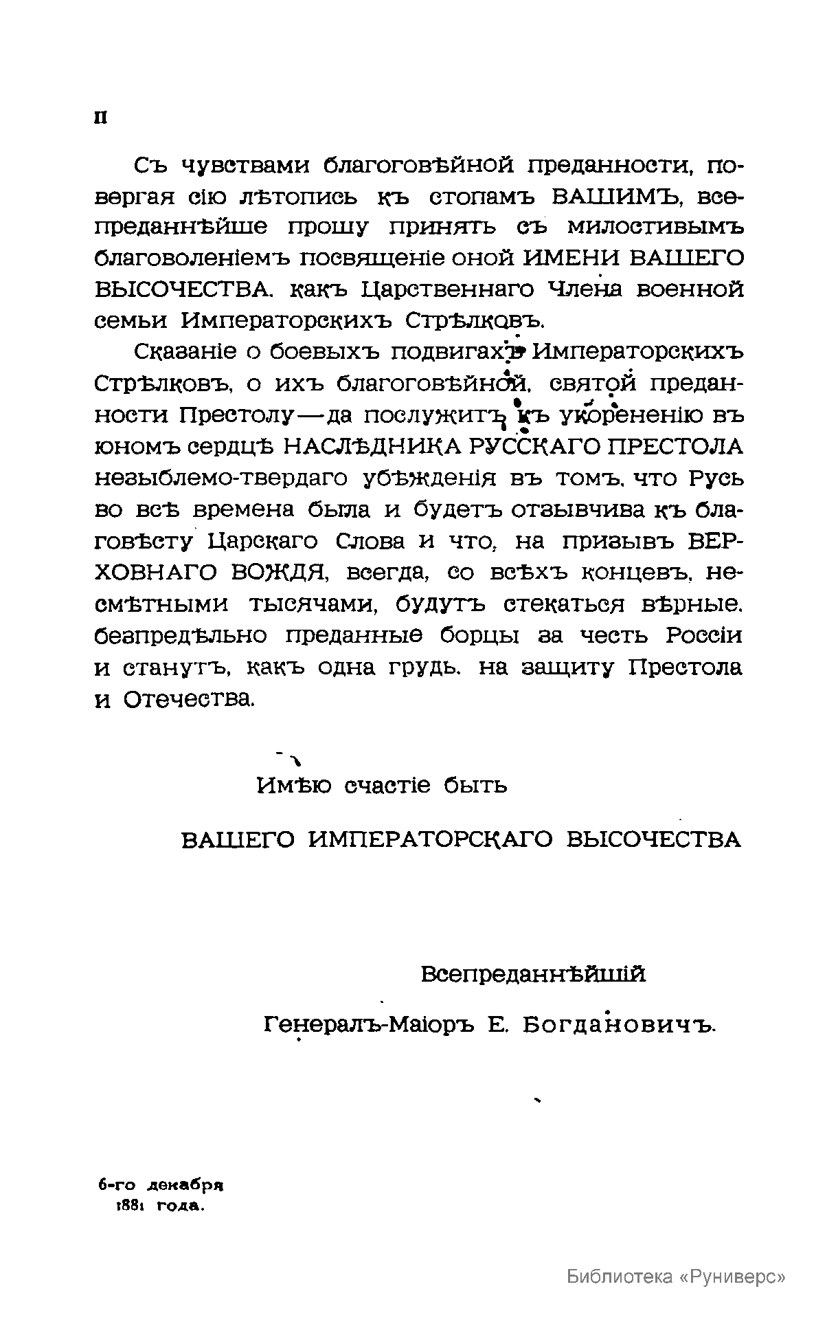 Исторический очерк, представляющий краткое популярное описание основных этапов создания и развития Лейб-гвардии стрелкового императорской фамилии полка и батальона принадлежит перу видного общественного деятеля последних трех царствований генералу Евгению Васильевичу Богдановичу, который долгие годы, вплоть до своей кончины, состоял почетным членом в этой элитной части. Инициатором создания этой уникальной по статусу воинской части, которая должна была стать образцом для всей российской армии, выступил сам император Николай I. Незадолго до своей смерти, 25 октября 1854 года, в начале Крымской войны, он повелел сформировать на время военных действий из числа крестьян призывных возрастов императорских уделов Стрелковый полк Императорской Фамилии. Менее чем через год полк был сформирован, затем был причислен к гвардейскому корпусу на правах молодой гвардии, а 1 октября 1856 года на мирное время он был уже расформирован. Офицеры и нижние чины поступили на формирование лейб-гвардии стрелкового Императорской Фамилии батальона, который был расквартирован в Гатчине. Само название батальона предполагало зачисление в списки батальона всех великих князей. В гатчинский период существования батальона в его списки были действительно зачислены почти все члены императорского дома. В дальнейшем в августе 1870 года батальон был отчислен в состав вновь сформированной Гвардейской стрелковой бригады под командованием великого князя Владимира Александровича, а через год был переименован в лейб-гвардии 4-й стрелковый Императорской Фамилии батальон. В период русско-турецкой войны 1877-1878 гг. личный состав батальона участвовал в боевых действиях, получив в награду георгиевское знамя «За отличие в Турецкую войну». Краткий очерк этой придворной воинской части, написанный Богдановичем в традиционном для него верноподданническом духе, освещает основные вехи её истории. В приложения к основному тексту автор приводит подробнейшие списки почетных членов батальона, а также списочный состав всех офицеров, проходивших службу в этой части.