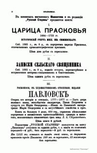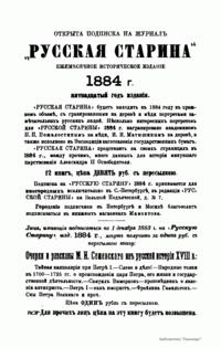 «Русская старина», ежемесячный исторический журнал, выходил в Петербурге в 1870-1918. Основан, издавался и редактировался (1870-1892) М. И. Семевским при участии В. И. Семевского. Последующими редакторами были Н. К. Шильдер (1892-1896), Н. Ф. Дубровин (1896-1904), военные историки С. П. Зыков, П. Н. Воронов.
