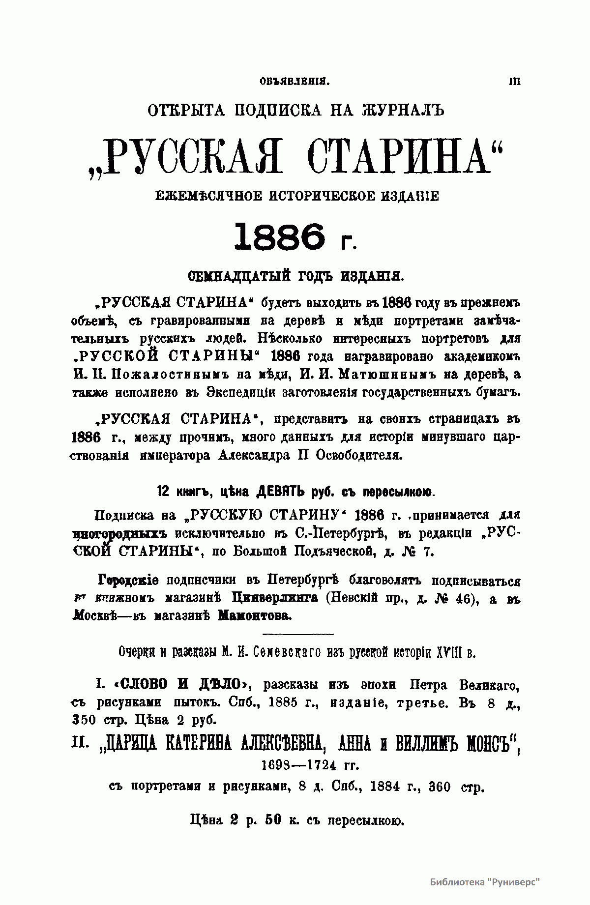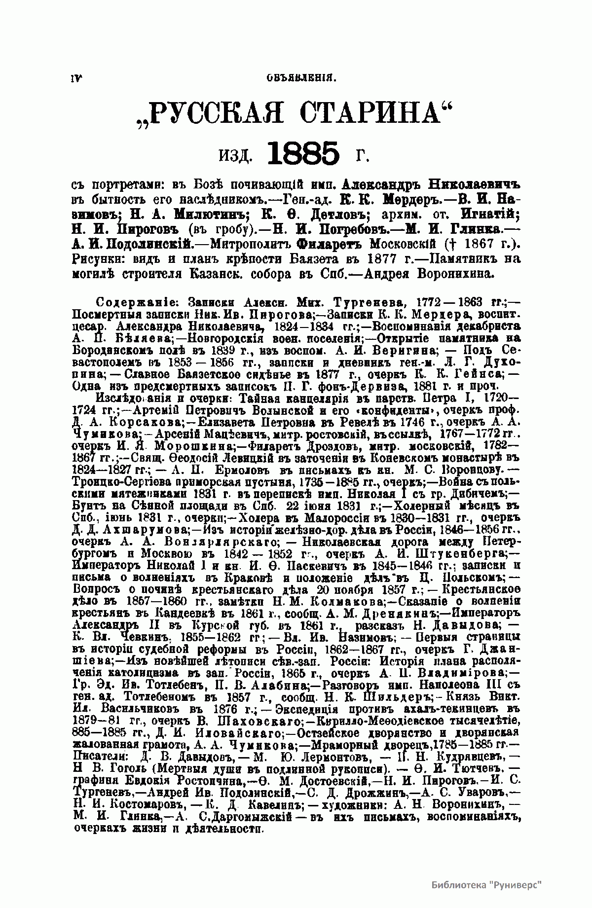 На страницах «Русской старины» напечатаны думы, послания, эпиграммы К. Ф. Рылеева, басни И. А. Крылова, И. И. Хемницера, Измайлова, стихотворения графа А. К. Толстого, К. Р., Я. Б. Княжнина, А. Н. Нахимова, К. П. Батюшкова, барона Дельвига, Розенгейма, В. А. Жуковского, М. Ю. Лермонтова, А. И. Одоевского, Кюхельбекера, Баратынского, вновь найденные строфы из «Евгения Онегина» и отрывки из «Мертвых душ», а также автобиографии и переписки писателей, под редакцией П. А. Ефремова. Статьи и исследования по вопросам новейшей русской истории принадлежат самому М. И. Семевскому, В. А. Бильбасову, А. П. Брикнеру, князю Н. С. Голицыну, Д. И. Иловайскому, П. И. Карцову, барону Н. А. Корфу, Н. И. Костомарову, И. И. Ореусу, А. Н. Петрову, В. И. Семевскому, Н. К. Шильдеру и др.К журналу выпущены отдельные издания: Указатель «Русская старина».СПб, 1883 г . (1 том), «Систематическая роспись содержания «Русской старины» за 1870-1884 гг.» (СПб., 1885), и четыре прибавления: за 1885-1887 гг. (СПб., 1888), за 1888-1890 гг. (СПб., 1891), за 1891-1896 гг. (СПб., 1897), за 1896-1902 гг. (СПб., 1903) (5 изданий в 3-х томах), сборник гравюр «Русские деятели в портретах изданных редакциею исторического журнала «Русская старина». СПб, 1886-1891 гг.(5 изданий, 2 тома).