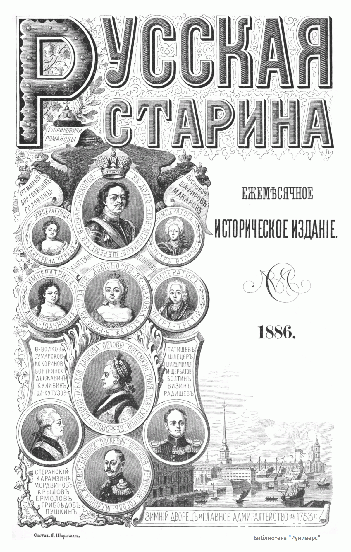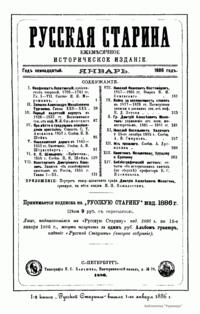 «Русская старина», ежемесячный исторический журнал, выходил в Петербурге в 1870-1918. Основан, издавался и редактировался (1870-1892) М. И. Семевским при участии В. И. Семевского. Последующими редакторами были Н. К. Шильдер (1892-1896), Н. Ф. Дубровин (1896-1904), военные историки С. П. Зыков, П. Н. Воронов.