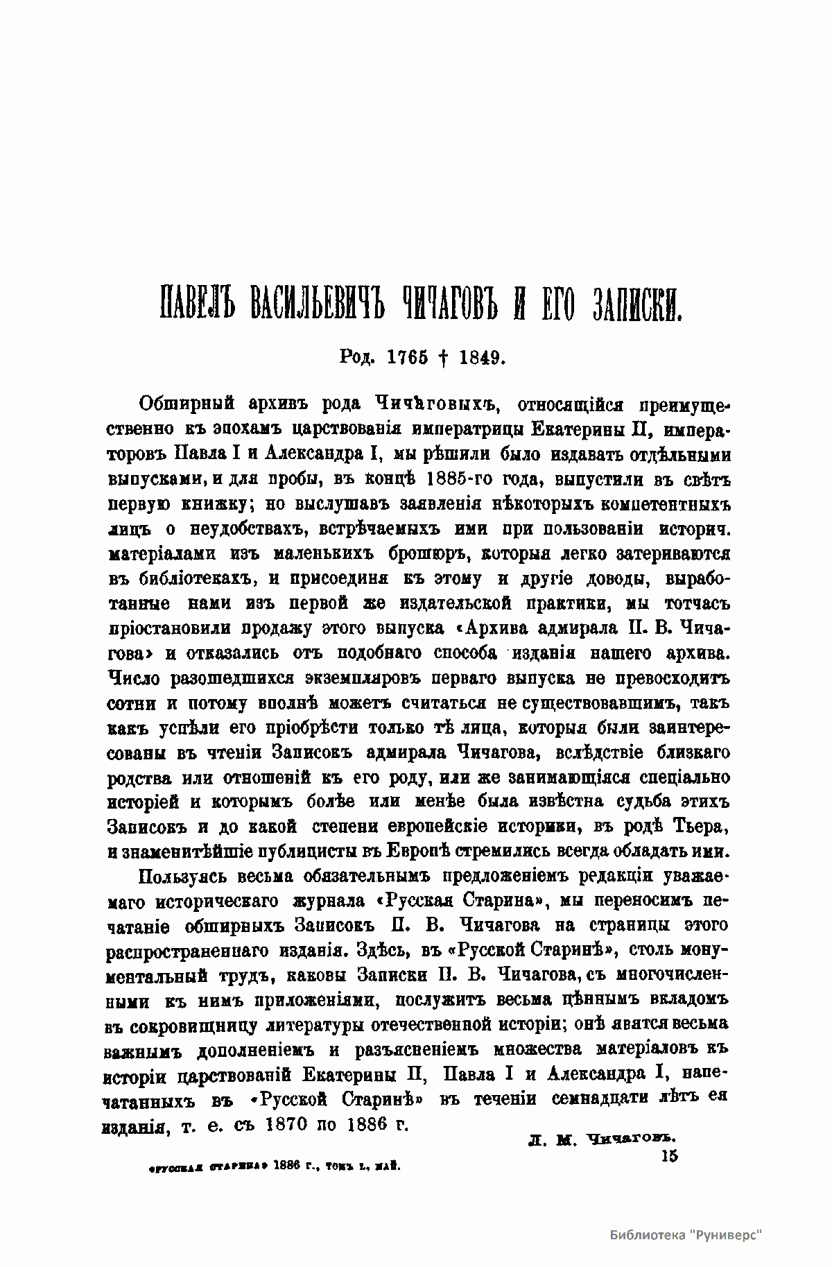 «Русская старина», ежемесячный исторический журнал, выходил в Петербурге в 1870-1918. Основан, издавался и редактировался (1870-1892) М. И. Семевским при участии В. И. Семевского. Последующими редакторами были Н. К. Шильдер (1892-1896), Н. Ф. Дубровин (1896-1904), военные историки С. П. Зыков, П. Н. Воронов.