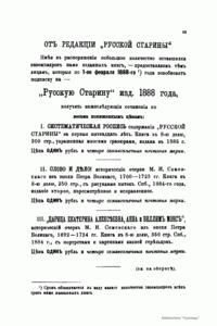 «Русская старина», ежемесячный исторический журнал, выходил в Петербурге в 1870-1918. Основан, издавался и редактировался (1870-1892) М. И. Семевским при участии В. И. Семевского. Последующими редакторами были Н. К. Шильдер (1892-1896), Н. Ф. Дубровин (1896-1904), военные историки С. П. Зыков, П. Н. Воронов.
