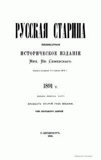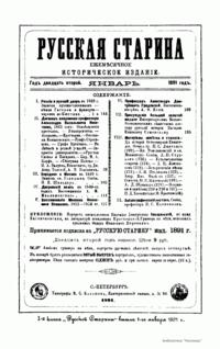 «Русская старина», ежемесячный исторический журнал, выходил в Петербурге в 1870-1918. Основан, издавался и редактировался (1870-1892) М. И. Семевским при участии В. И. Семевского. Последующими редакторами были Н. К. Шильдер (1892-1896), Н. Ф. Дубровин (1896-1904), военные историки С. П. Зыков, П. Н. Воронов.