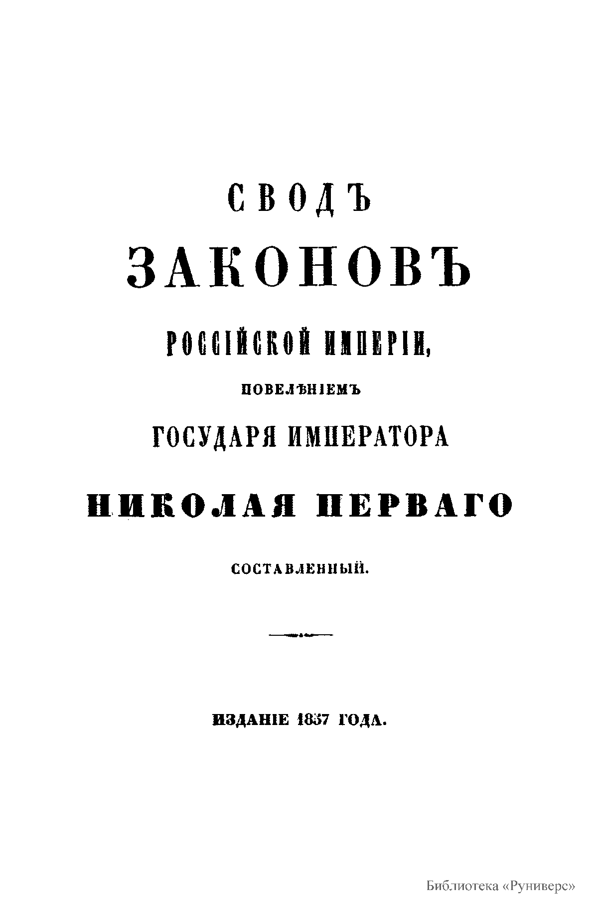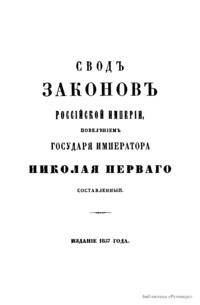Свод законов Российской империи— официальное собрание расположенных в тематическом порядке действующих законодательных актов Российской империи, созданное при Николае I. Впервые он был напечатан в 1832 году. Манифестом 31 января 1833 года Свод законов был объявлен действующим источником права с 1 января 1835 года. Первое издание 1832 года и последующие 1842-го и 1857 года состояли из пятнадцати томов. После 1857 года Свод законов полностью не переиздавался, а выходили лишь отдельные тома. В качестве отдельного – 16-го тома в 1885 году вышли Судебные уставы. Между изданиями Свода законов выходили ежегодные и сводные (за несколько лет) «Продолжения» Свода законов с указанием на упраздненные и измененные статьи. В своде законов собраны все реально действовавшие в определенный момент времени законы по тем или иным проблемам права, это справочник для юристов. Отбор законодательного материала для включения в Свод производился на основе Полного собрания законов (первое Полное собрание законов, появившееся в 1830 году, состояло из 45 томов, содержащих 30 920 актов и 6 томов приложений). Собрание законов – это в большой степени историческое издание. По нему можно изучать развитие, направление правительственной мысли в стране. Это летопись отечественного законотворчества. Изучая страницу за страницей эту летопись, мы можем узнать, что в тот или иной момент истории являлось злобой дня.