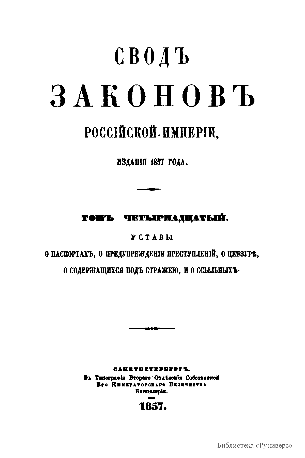 Свод законов Российской империи. Том четырнадцатый. Уставы о паспортах, о предупреждении преступлений, о цензуре, о содержащихся под стражею, и о ссыльных