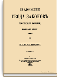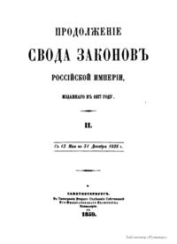 Свод законов Российской империи— официальное собрание расположенных в тематическом порядке действующих законодательных актов Российской империи, созданное при Николае I. Впервые он был напечатан в 1832 году. Манифестом 31 января 1833 года Свод законов был объявлен действующим источником права с 1 января 1835 года. Первое издание 1832 года и последующие 1842-го и 1857 года состояли из пятнадцати томов. После 1857 года Свод законов полностью не переиздавался, а выходили лишь отдельные тома. В качестве отдельного – 16-го тома в 1885 году вышли Судебные уставы. Между изданиями Свода законов выходили ежегодные и сводные (за несколько лет) «Продолжения» Свода законов с указанием на упраздненные и измененные статьи. В своде законов собраны все реально действовавшие в определенный момент времени законы по тем или иным проблемам права, это справочник для юристов. Отбор законодательного материала для включения в Свод производился на основе Полного собрания законов (первое Полное собрание законов, появившееся в 1830 году, состояло из 45 томов, содержащих 30 920 актов и 6 томов приложений). Собрание законов – это в большой степени историческое издание. По нему можно изучать развитие, направление правительственной мысли в стране. Это летопись отечественного законотворчества. Изучая страницу за страницей эту летопись, мы можем узнать, что в тот или иной момент истории являлось злобой дня.