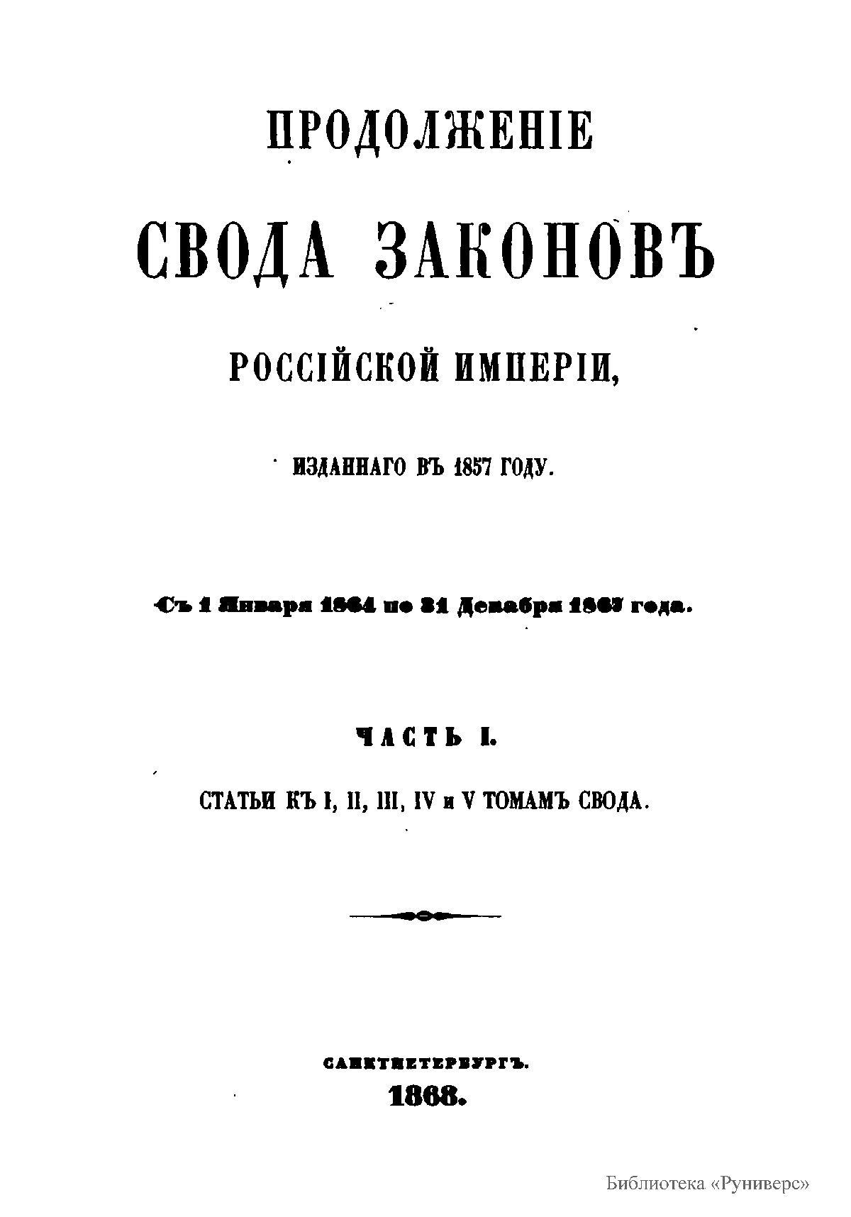 Продолжение свода законов Российской империи, изданного в 1857 году. С 1 января 1864 по 31 декабря 1867 года. Часть I. Статьи к I, II, III, IV и V томам свода