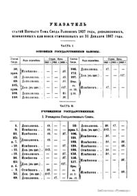 Свод законов Российской империи— официальное собрание расположенных в тематическом порядке действующих законодательных актов Российской империи, созданное при Николае I. Впервые он был напечатан в 1832 году. Манифестом 31 января 1833 года Свод законов был объявлен действующим источником права с 1 января 1835 года. Первое издание 1832 года и последующие 1842-го и 1857 года состояли из пятнадцати томов. После 1857 года Свод законов полностью не переиздавался, а выходили лишь отдельные тома. В качестве отдельного – 16-го тома в 1885 году вышли Судебные уставы. Между изданиями Свода законов выходили ежегодные и сводные (за несколько лет) «Продолжения» Свода законов с указанием на упраздненные и измененные статьи. В своде законов собраны все реально действовавшие в определенный момент времени законы по тем или иным проблемам права, это справочник для юристов. Отбор законодательного материала для включения в Свод производился на основе Полного собрания законов (первое Полное собрание законов, появившееся в 1830 году, состояло из 45 томов, содержащих 30 920 актов и 6 томов приложений). Собрание законов – это в большой степени историческое издание. По нему можно изучать развитие, направление правительственной мысли в стране. Это летопись отечественного законотворчества. Изучая страницу за страницей эту летопись, мы можем узнать, что в тот или иной момент истории являлось злобой дня.
