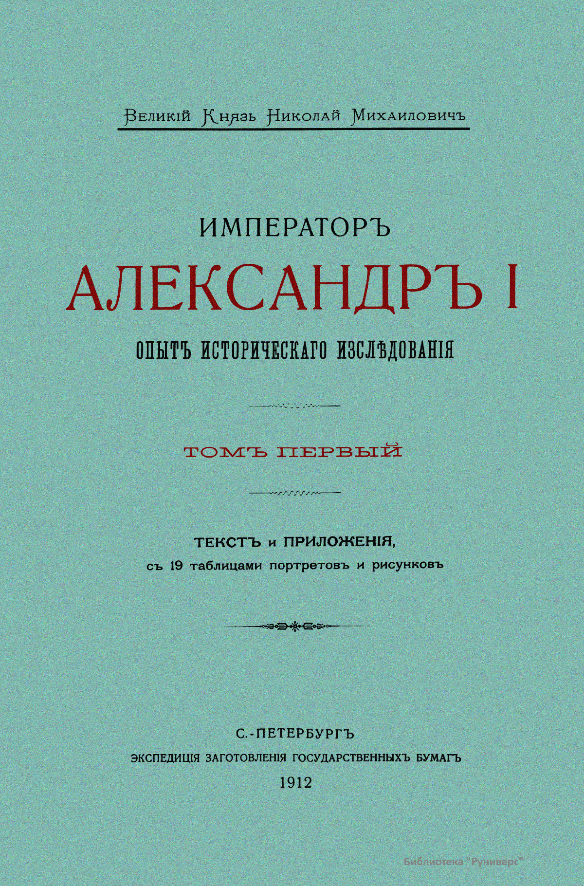 Великий князь Николай Михайлович – автор многих исторических трудов, посвященных эпохе Александра I и наполеоновских войн. «Император Александр I. Опыт исторического исследования» в двух томах (на французском языке. СПб., 1912. 2-е изд., 1914) – наиболее фундаментальный из них. Несмотря на обилие исторической литературы об эпохе Александра I, эта книга явилась новым словом в науке. Новизна ее состояла в том, что Николай Михайлович использовал много ранее недоступных материалов, хранящихся в секретных государственных архивах, на пользование которыми мог дать разрешение только император. Ему такое разрешение давалось. Естественно, доступ к закрытым архивам позволил по-иному проанализировать те или иные обстоятельства жизни Александра I. Также и все другие исследования александровской эпохи писались им с подобным изучением архивов и открыли много новых исторических фактов. В предисловии к изданию автор говорит о том, что стремился дать опыт исторического исследования характера и деятельности Александра Павловича не только как государя и повелителя земли русской, но и как человека. Кроме того, автор заявляет о своей беспристрастности: «…Мы даем материалы, которыми будущие русские историки могут воспользоваться. Не нам также решать вопрос, возвеличит или понизит предлагаемое исследование образ монарха». Первый том охватывает период с 1801 по 1825 год, содержит приложения и 46 иллюстраций. Во втором томе находятся различные документы и письма.