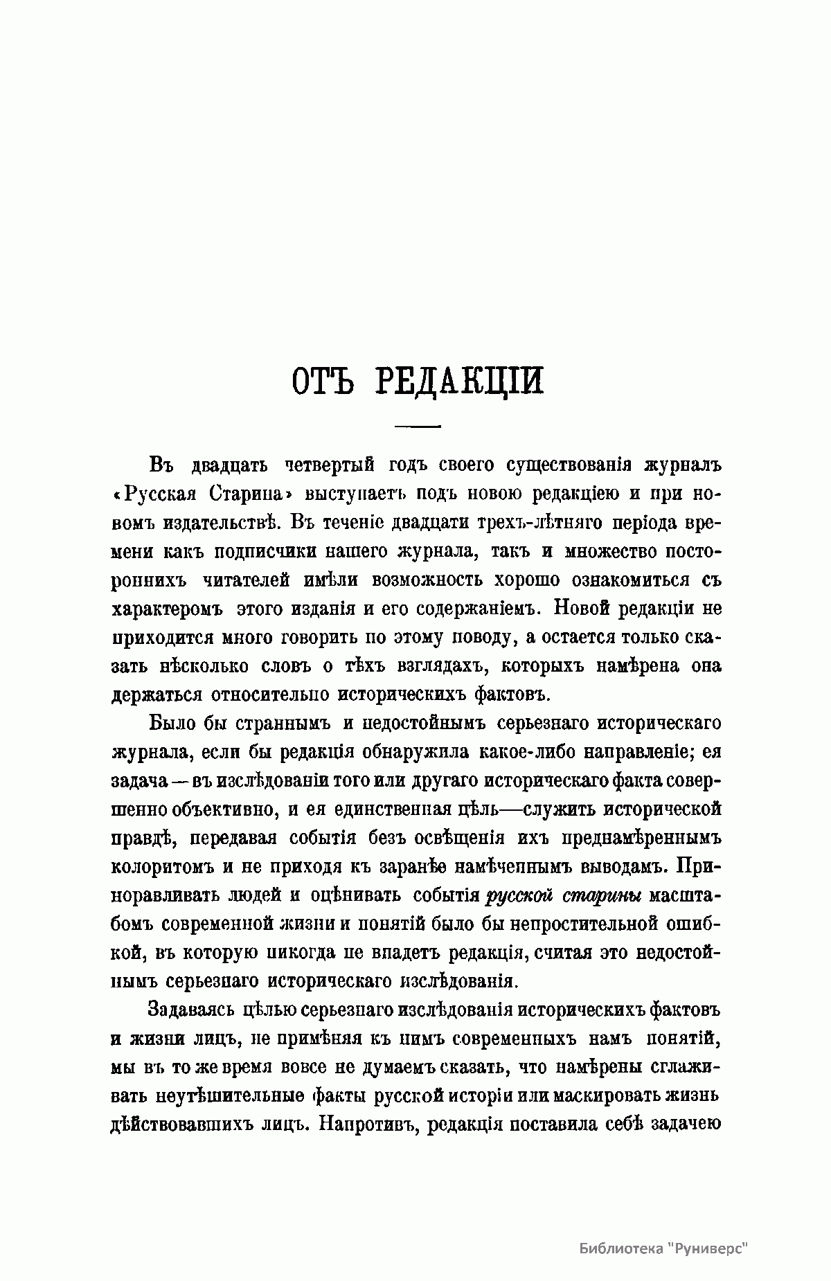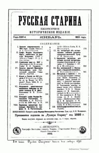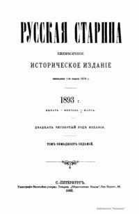 «Русская старина», ежемесячный исторический журнал, выходил в Петербурге в 1870-1918. Основан, издавался и редактировался (1870-1892) М. И. Семевским при участии В. И. Семевского. Последующими редакторами были Н. К. Шильдер (1892-1896), Н. Ф. Дубровин (1896-1904), военные историки С. П. Зыков, П. Н. Воронов.