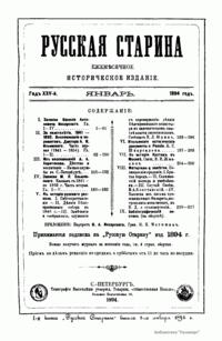 «Русская старина», ежемесячный исторический журнал, выходил в Петербурге в 1870-1918. Основан, издавался и редактировался (1870-1892) М. И. Семевским при участии В. И. Семевского. Последующими редакторами были Н. К. Шильдер (1892-1896), Н. Ф. Дубровин (1896-1904), военные историки С. П. Зыков, П. Н. Воронов.