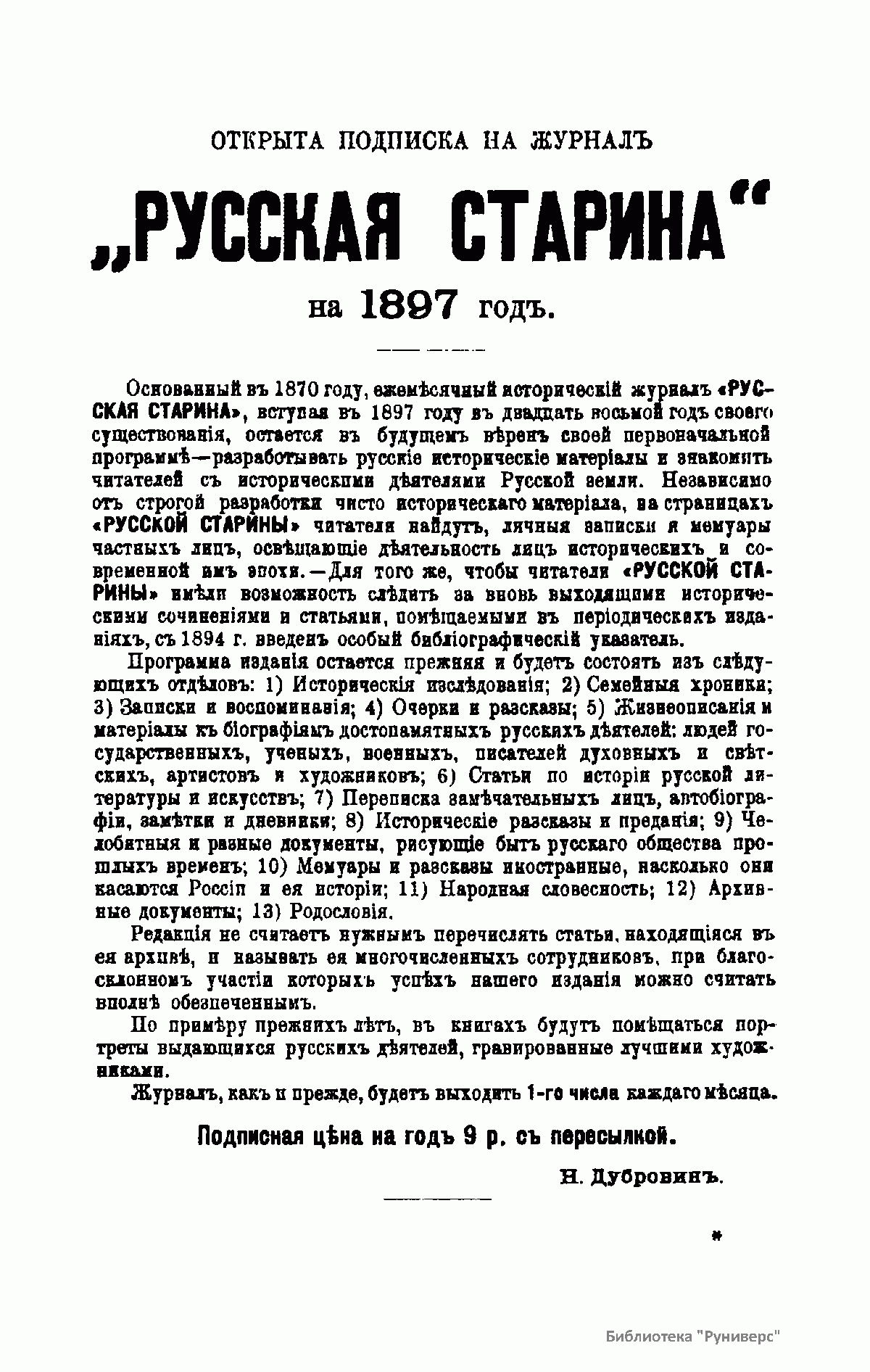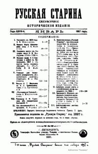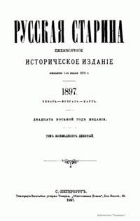 «Русская старина», ежемесячный исторический журнал, выходил в Петербурге в 1870-1918. Основан, издавался и редактировался (1870-1892) М. И. Семевским при участии В. И. Семевского. Последующими редакторами были Н. К. Шильдер (1892-1896), Н. Ф. Дубровин (1896-1904), военные историки С. П. Зыков, П. Н. Воронов.
