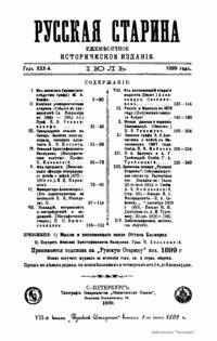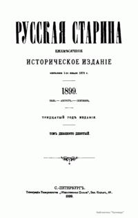 «Русская старина», ежемесячный исторический журнал, выходил в Петербурге в 1870-1918. Основан, издавался и редактировался (1870-1892) М. И. Семевским при участии В. И. Семевского. Последующими редакторами были Н. К. Шильдер (1892-1896), Н. Ф. Дубровин (1896-1904), военные историки С. П. Зыков, П. Н. Воронов.