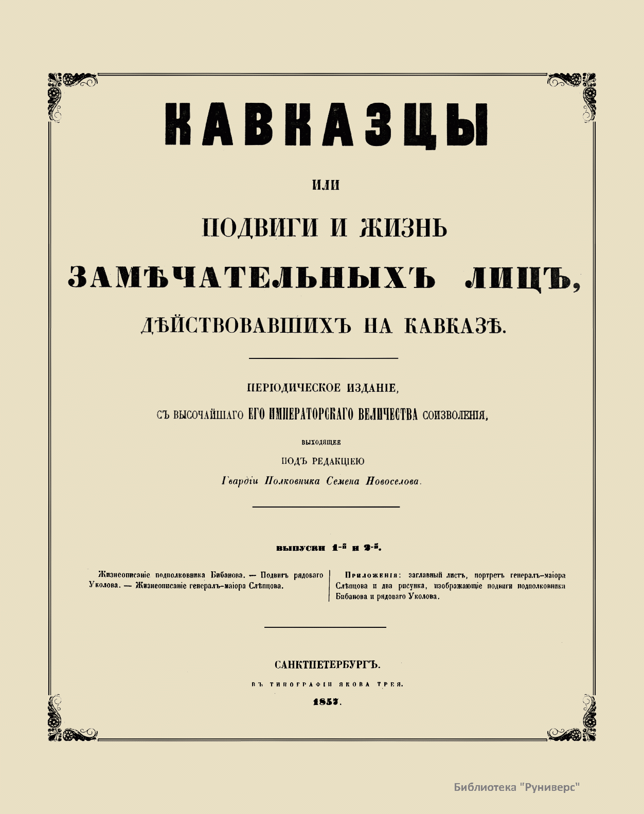 Кавказцы или подвиги и жизнь замѣчательныхъ лицъ дѣйствовавшихъ на Кавказѣ